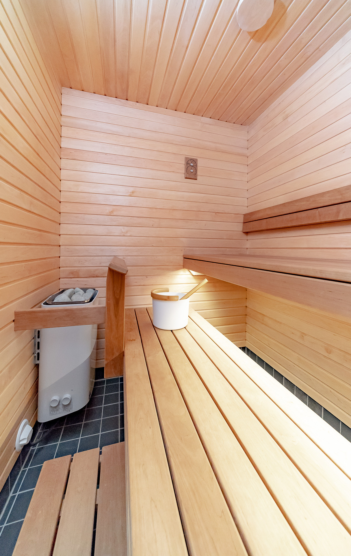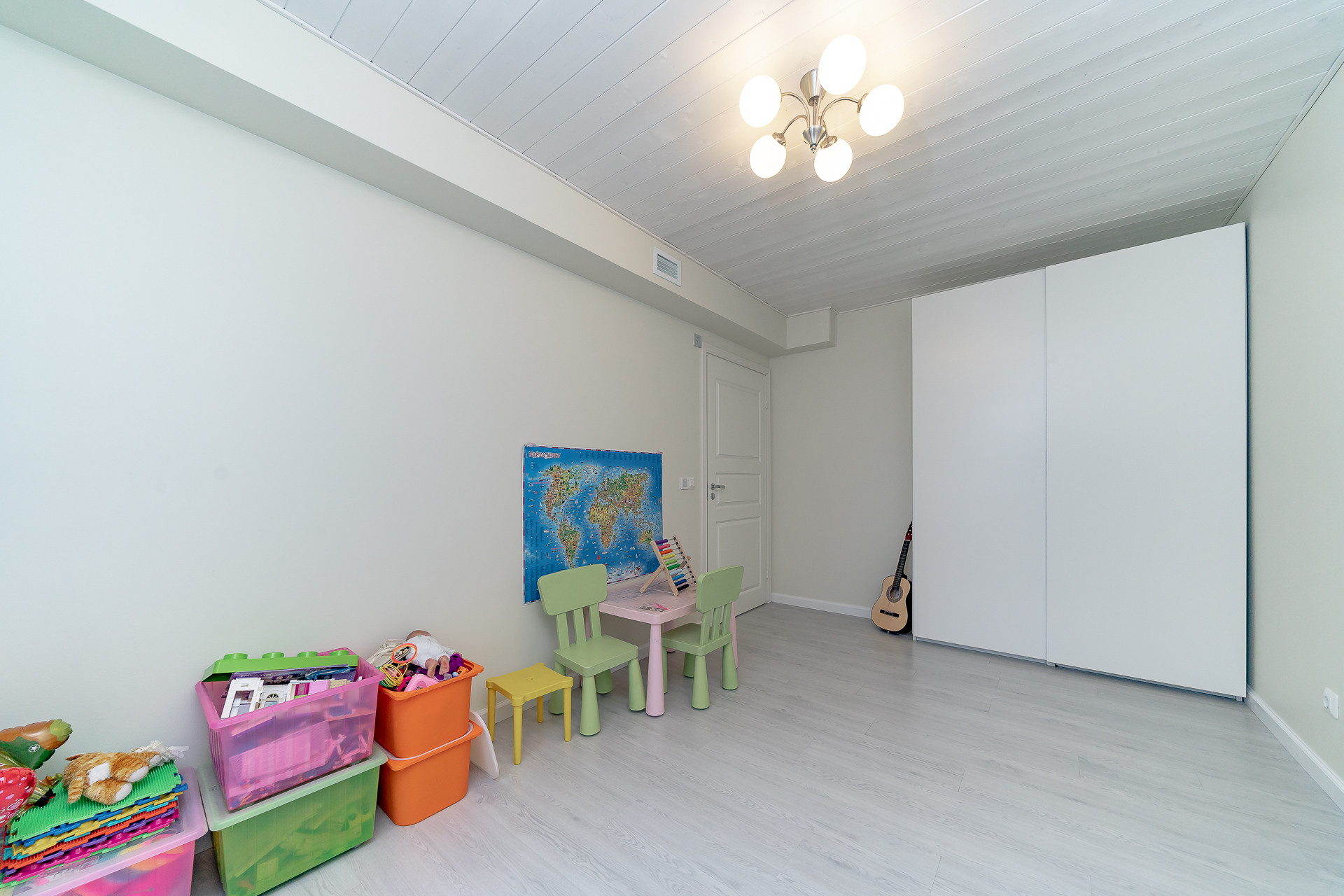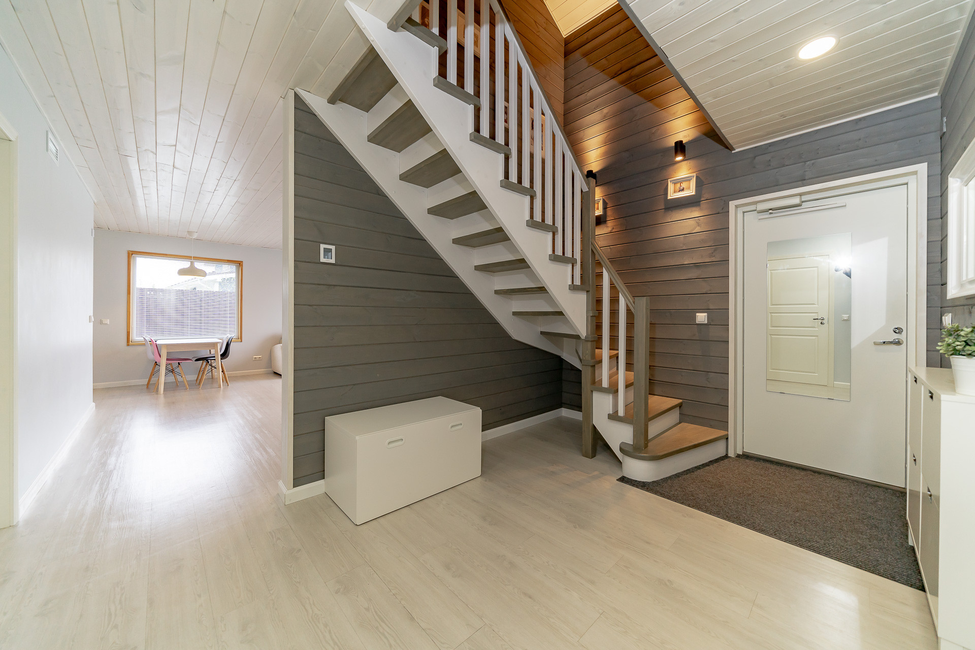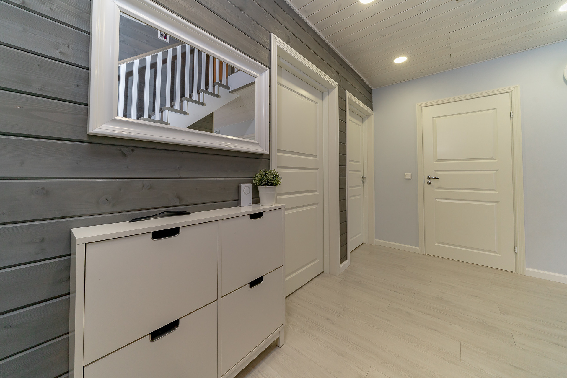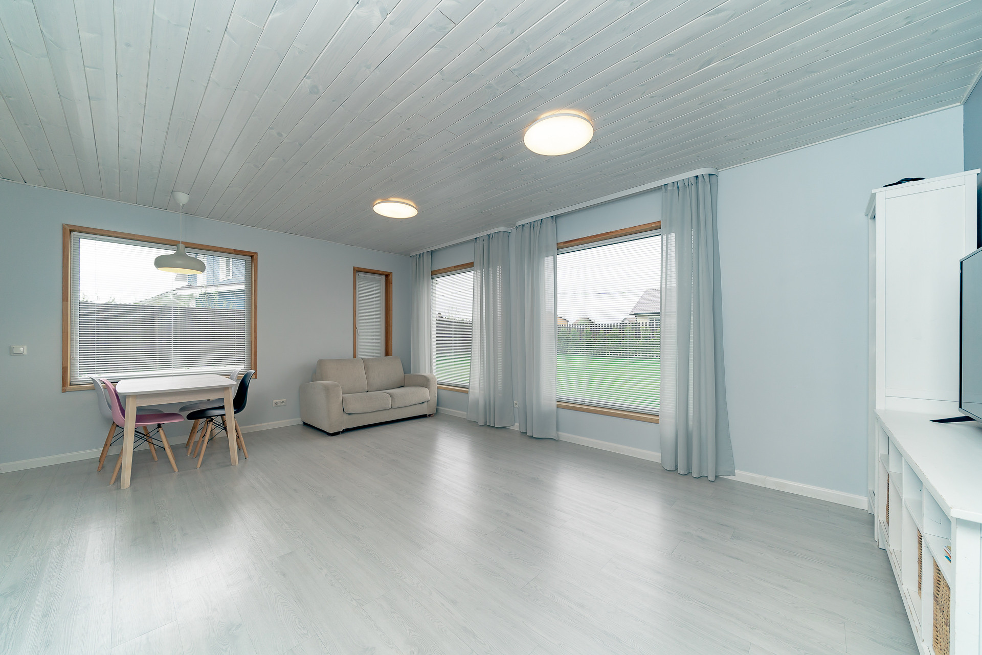 - 1 этаж: кухня-гостиная – 32,9 м², комната-кабинет – 8,1 м², комната – 13,5 м², душевая с сауной 6,8 м², санузел – 2,8 м², хозяйственное помещение - 6,5 м², холл – 12 м²;