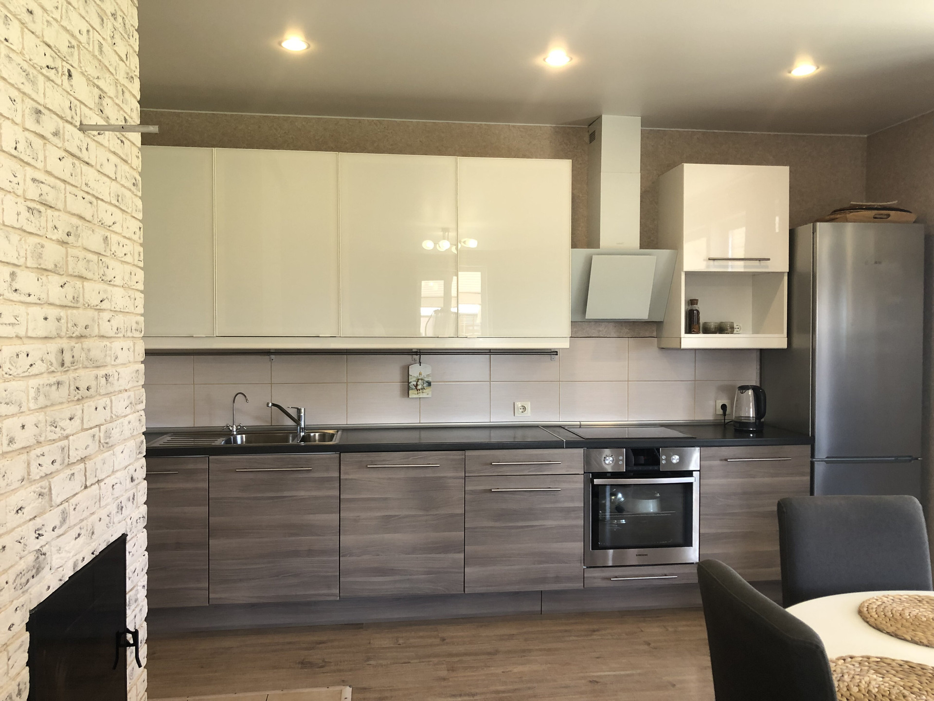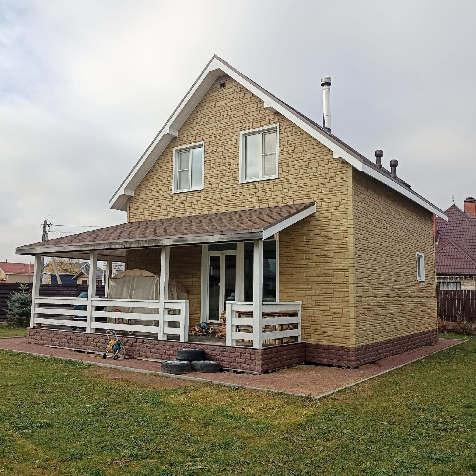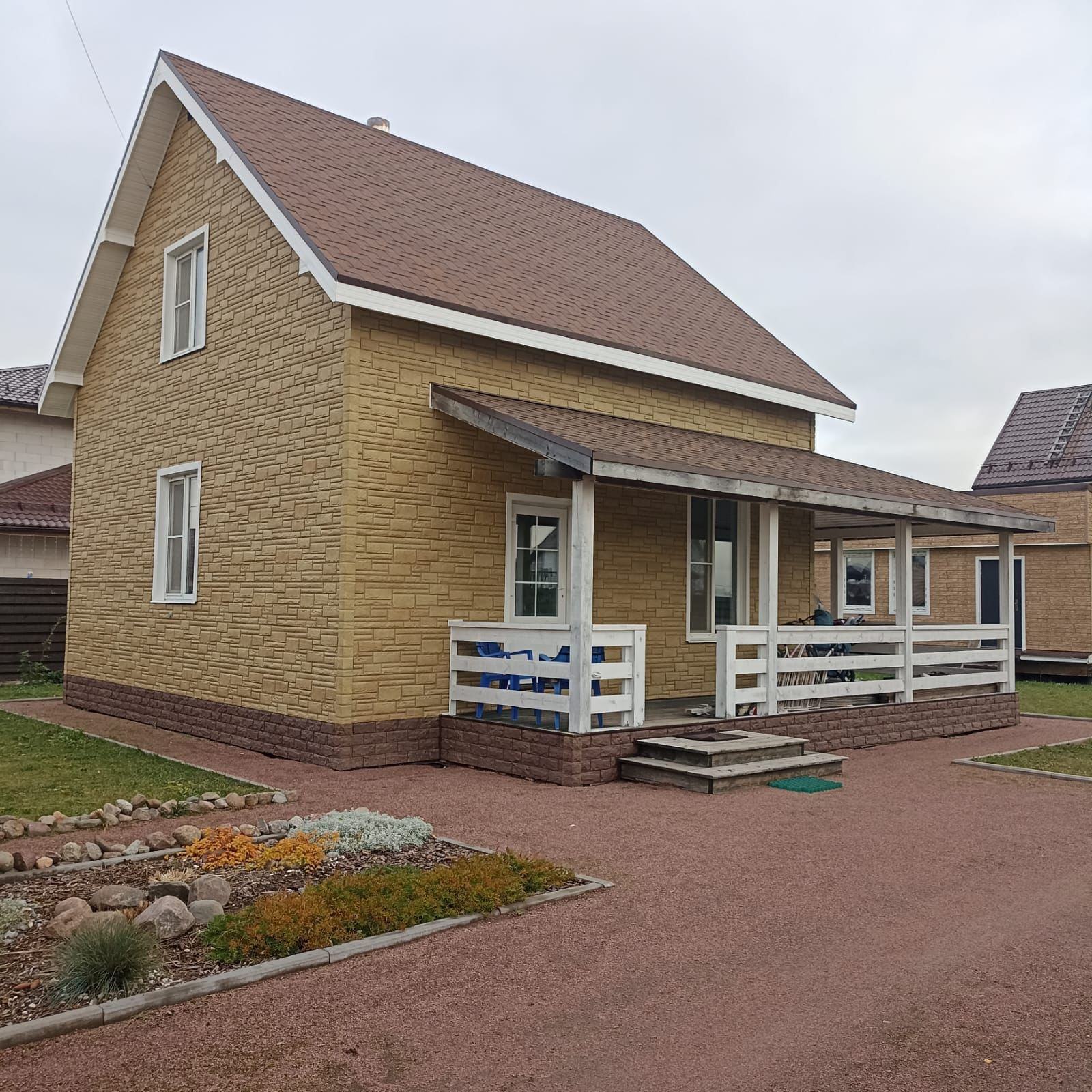 Продаётся дом 105м² на участке 6,7сот., рядом гостевой дом 40м²  без внутренней отделки. Дом построен из СИП панелей, утеплён rockwool. Энергоэффективность подтверждена специальным обследованием с использованием тепловизора в зимний период. Материал фасада пластиковые панели с имитацией камня. В доме два санузла, тёплые полы, конвекторы, камин; надувной бассейн на 10куб.м., бытовая техника и мебель остаются, . Все этажи имеют бетонную стяжку, никаких скрипов, натяжные потолки, лестница с автоподсветкой. Всевозможные электрозащиты. Стоянка на три легковых автомобиля, смонтирована электропроводка для автоматизации ворот и освещения. Участок выровнен, насыпана плодородная почва, смонтирован дренаж, центральное водоснабжение, водоотведение, электричество 15 кВт. Можно подключить газ, газопровод в 10м от дома, интернет, охрана, освещение посёлка, детская и спортивная площадки, зимой каток. Рядом лес, озеро, платный горнолыжный склон. В течение года проходят праздничные мероприятия, тематические ярмарки и прочее. Детский сад в ближайшем населённом пункте Хапо-ое, там же супермаркет Пятёрочка, аптека, Почта России, пекарня и пункты выдачи интернет-заказов (на машине 10мин.). Школа в Разметелево, из посёлка ездит школьный автобус. Из посёлка в город - автобус 429 до Ладожского вокзала.
