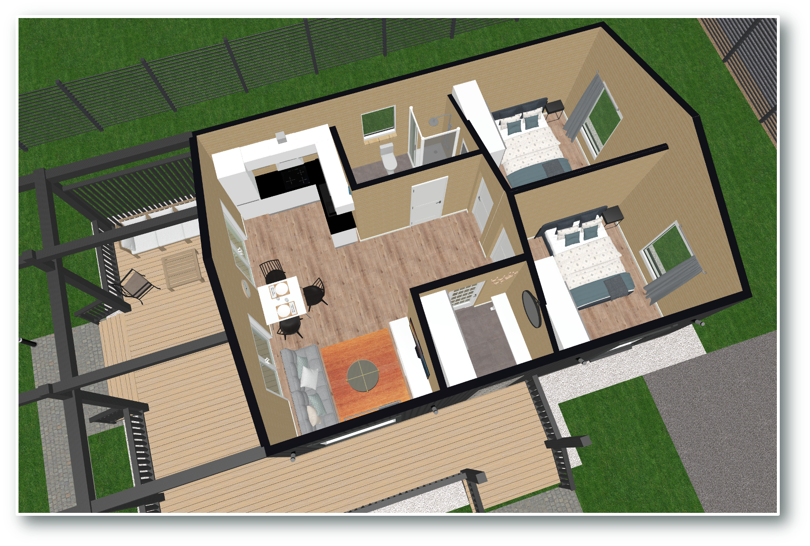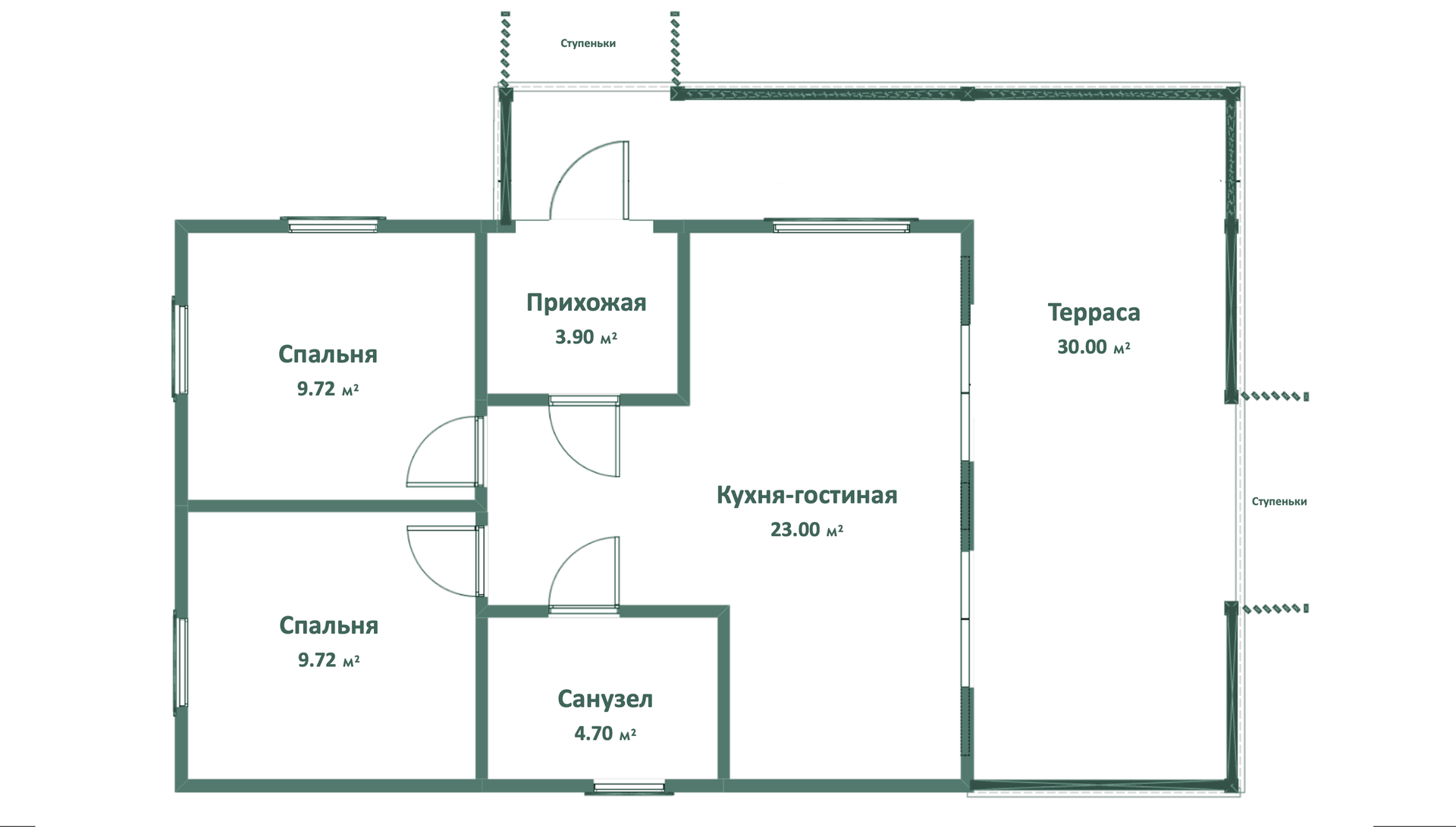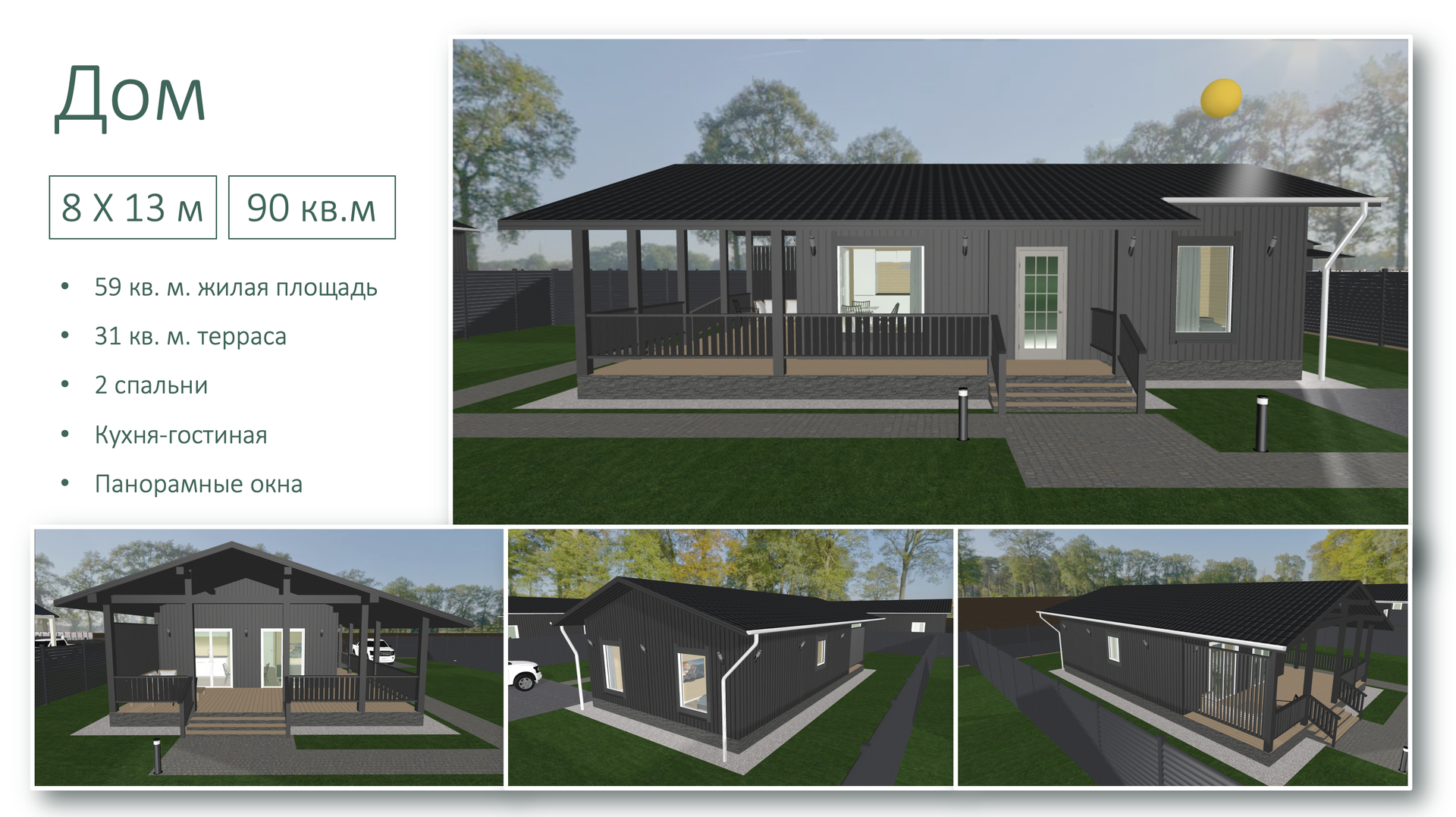 - Площадь: 60 м² жилая площадь + 31 м² терраса