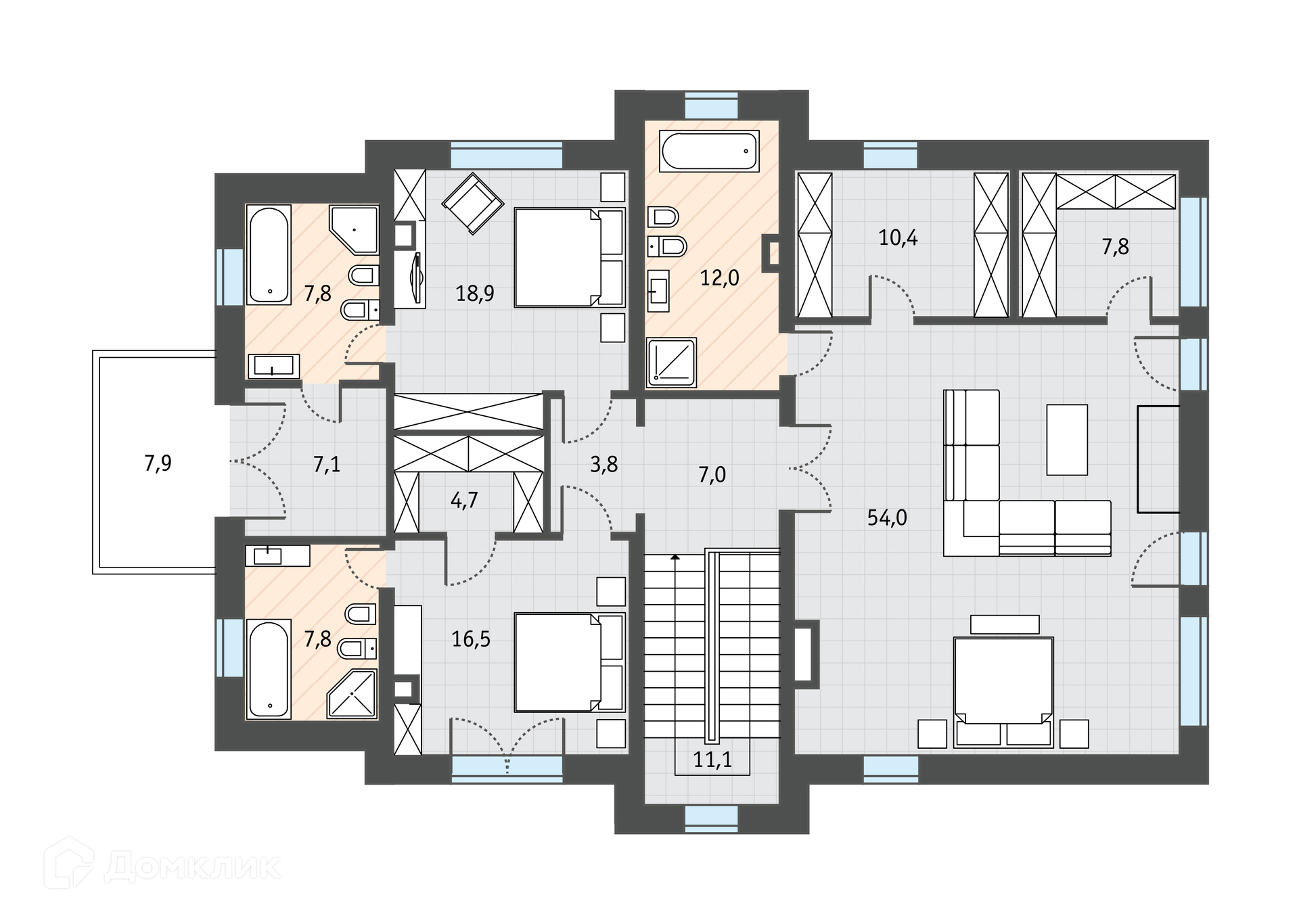 Возможность организовать до 5 спален. Или 4 спальни + кабинет. Комплектация домов 460 м2 (дом 340 м2 + гараж/блок_персонала 120 м2).Фундамент: железобетонный ростверк по буронабивным сваям.