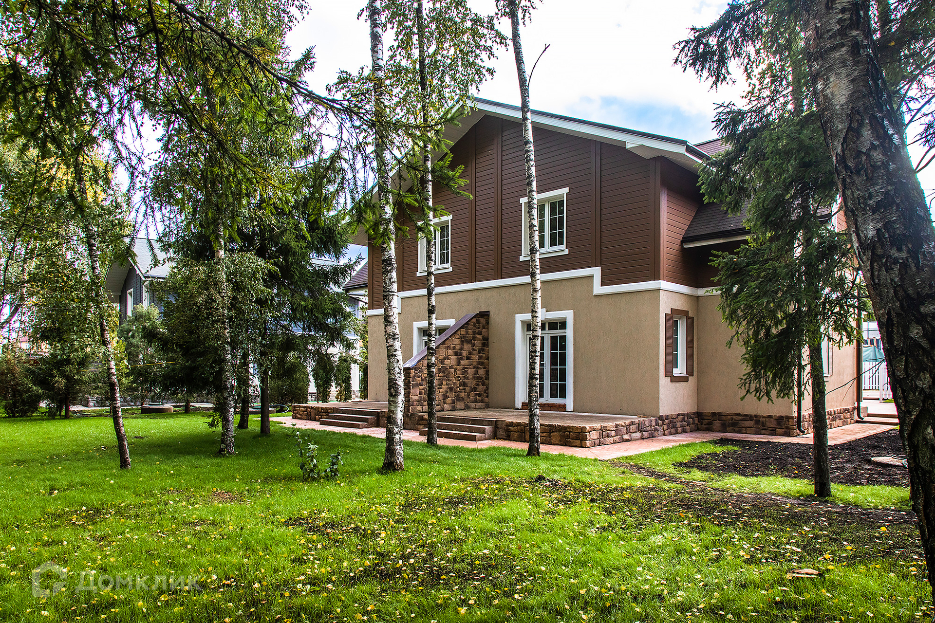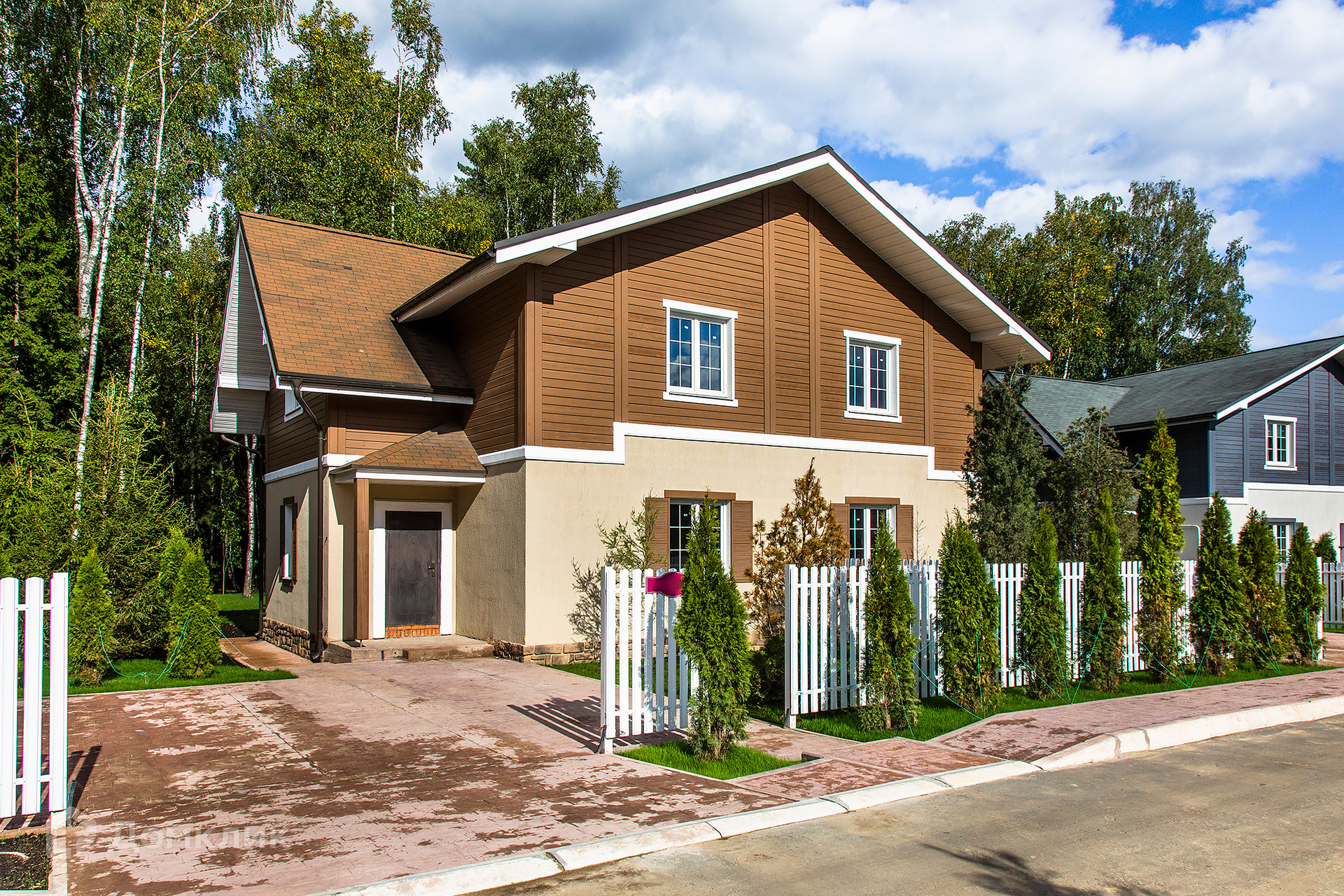 Готовый дуплекс в  жилом охраняемом поселке,  площадью секции 143 м².  На лесном участке 5,2 сотки сохранены взрослые деревья. Участок граничит с сосновым бором 7,5 га, можно организовать собственный выход в лесную зону. В стоимость дуплекса входят: подключение коммуникаций (водопровод, канализация, электричество 15 кВт, газ по границе участка); благоустроенный зеленый участок с газоном и дорожками к дому, парковочное место, выложенное полимерным бетоном, для двух автомобилей и невысокий забор.  Все коммуникации действующие. Подъезд асфальтированный.