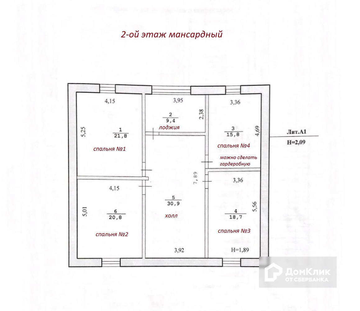 мансарда жилая: холл – 30,9 м2, спальня № 1 – 21,8 м2, спальня № 2 – 20,8 м2, спальня № 3 – 18,7 м2, спальня № 4 (можно сделать гардеробную) – 15,8 м2, лоджия – 9,4 м2, высота потолка – 2,10 метра, есть выходы для сан.узла;