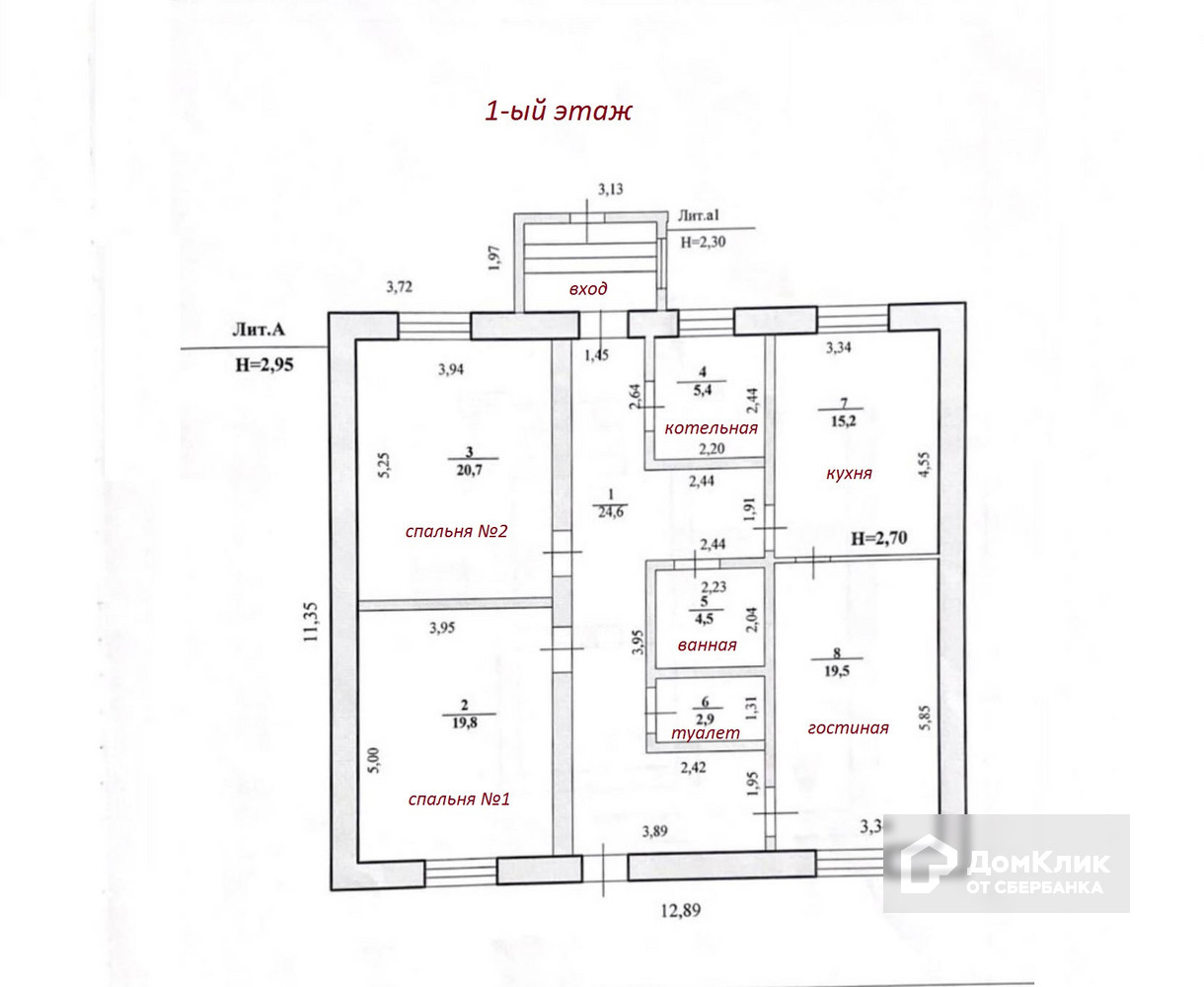 1-ый этаж: коридор – 24,6 м2, гостиная – 19,5 м2, кухня – 15,2 м2, спальня № 1 – 20,7 м2, спальня № 2 – 19,8 м2, котельная с гардеробной зоной – 5,4 м2, ванная – 4,5 м2, туалет – 2,9 м2, высота потолка – 2,7 метра;