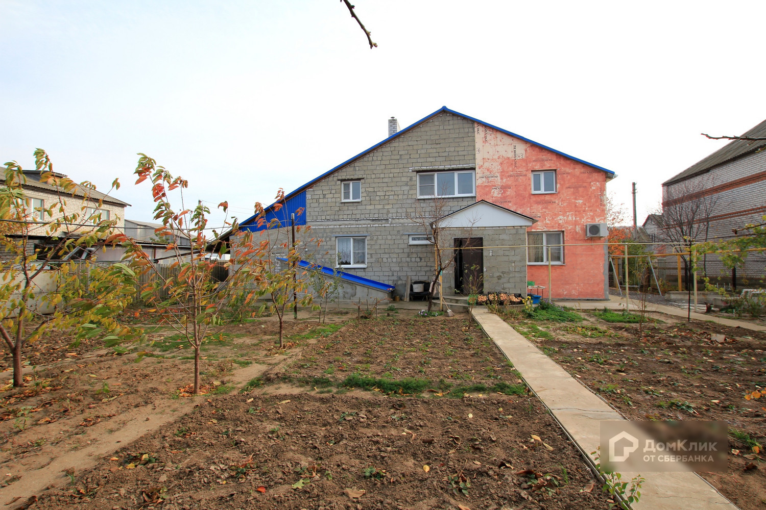 На участке, гараж пристроенный к дому, летняя кухня, сараи, молодые плодовые деревья.