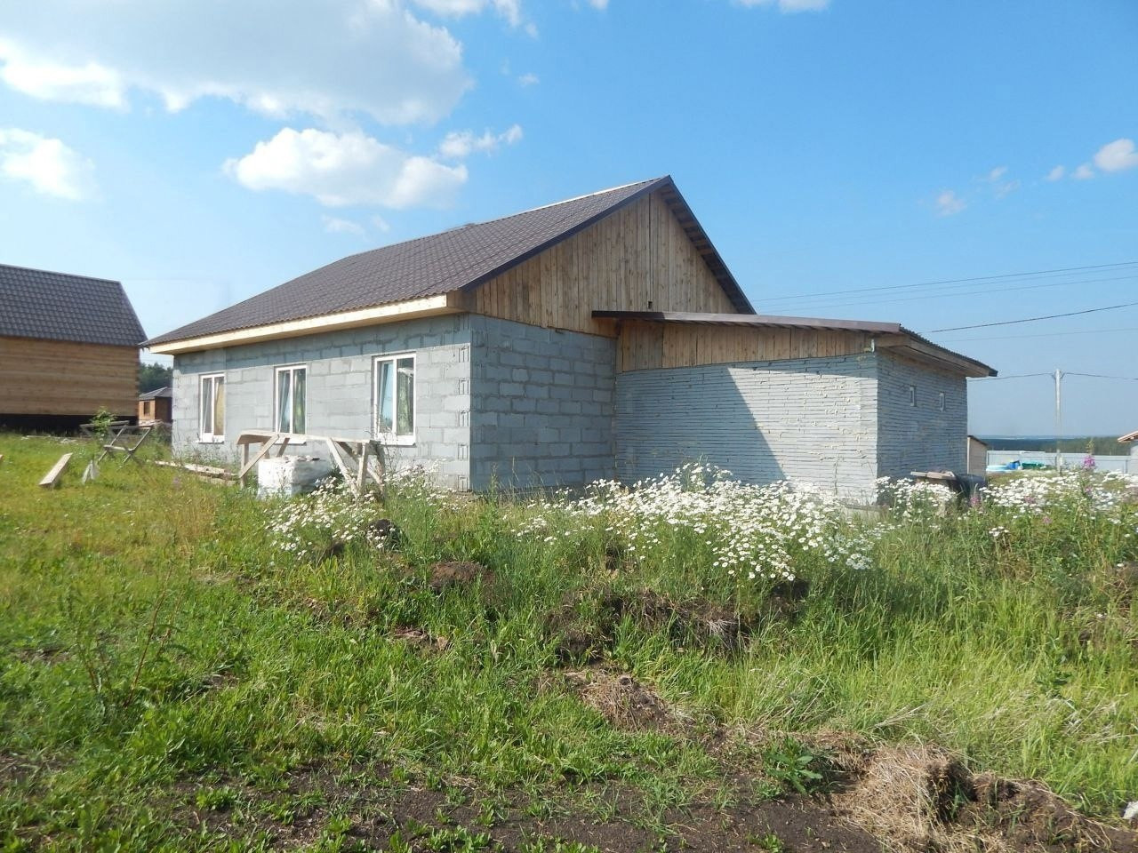 Дом построен на свайной основе 3 метра. Дом накрыт металлочерепицей. Во всех комнатах (3 комнаты, кухня и ванная комната) натяжные потолки, также установлены пластиковые окна. Все стены отштукатурены и готовы к поклейке обоев.