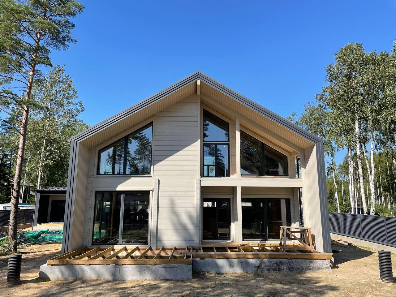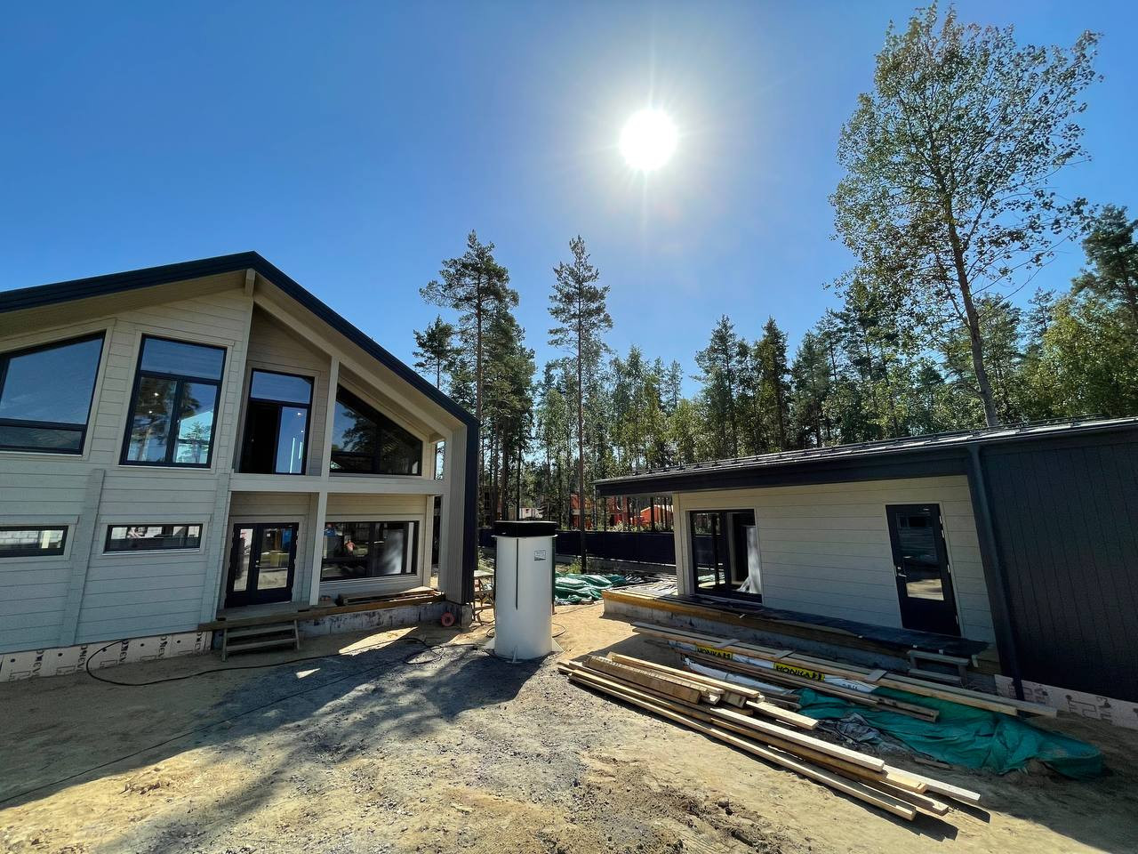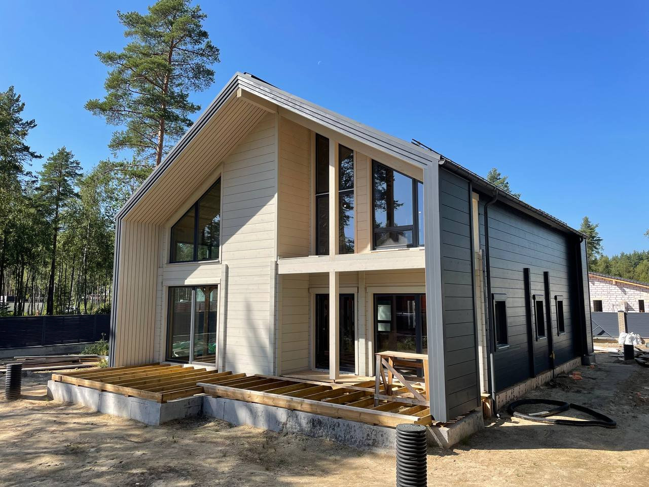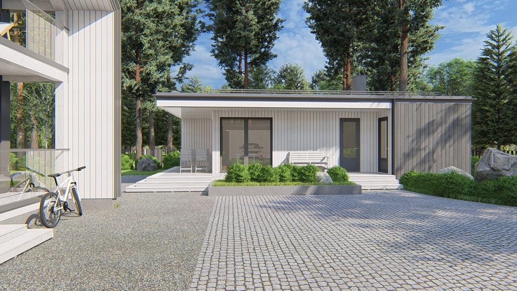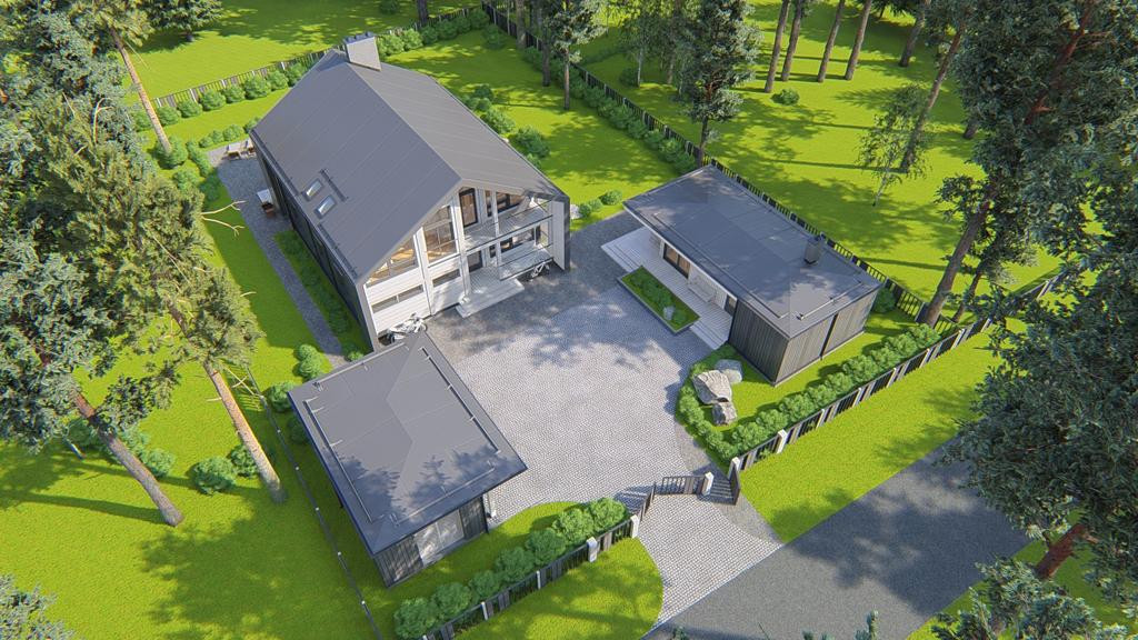 — дом общей площадью 303 м2 в современном стиле Barnhouse из клееного бруса производства Honka (Финляндия);