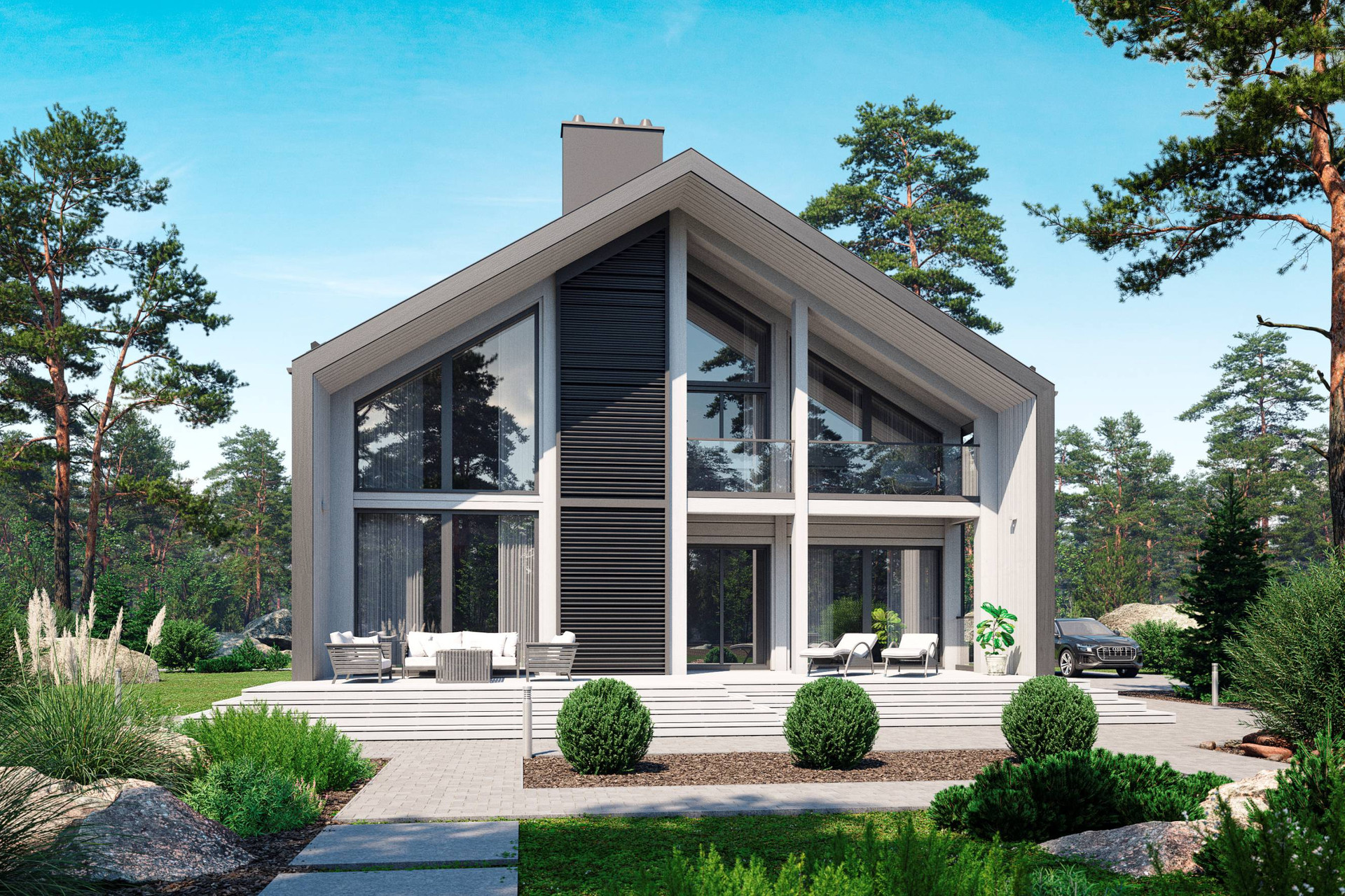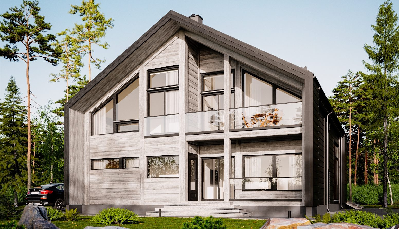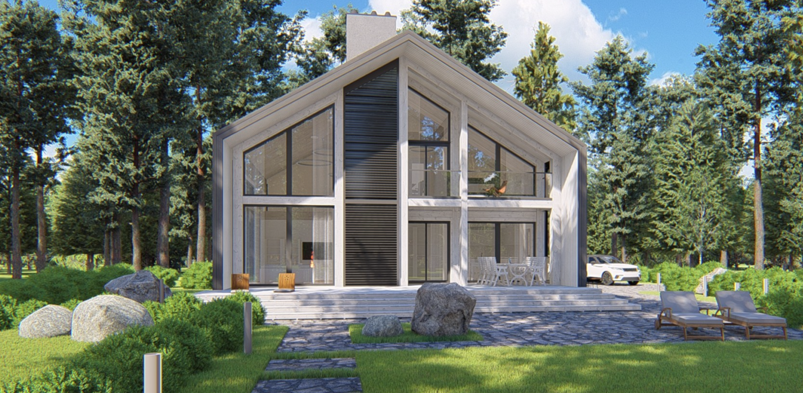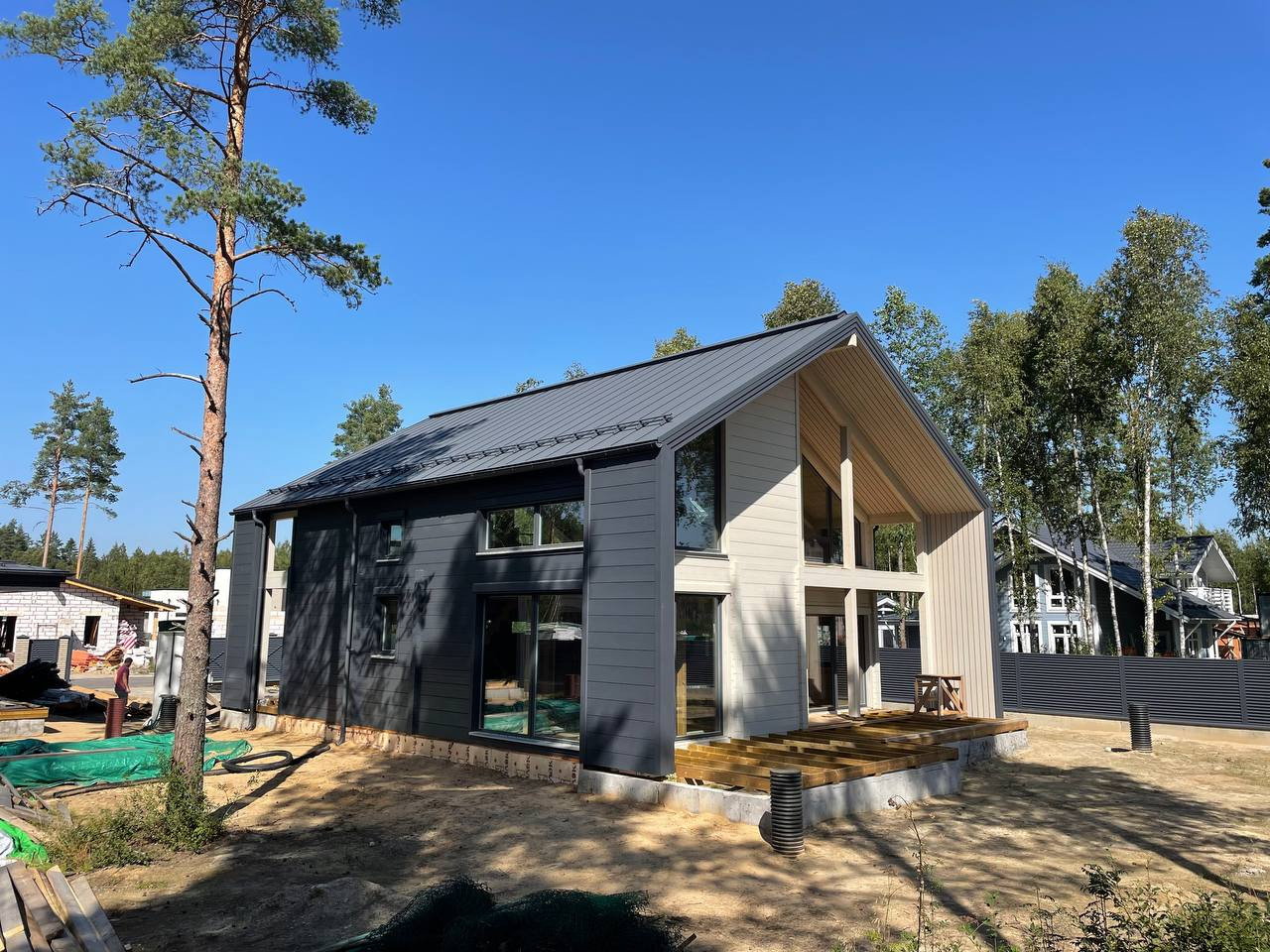 — дом общей площадью 303 м2 в современном стиле Barnhouse из клееного бруса производства Honka (Финляндия);