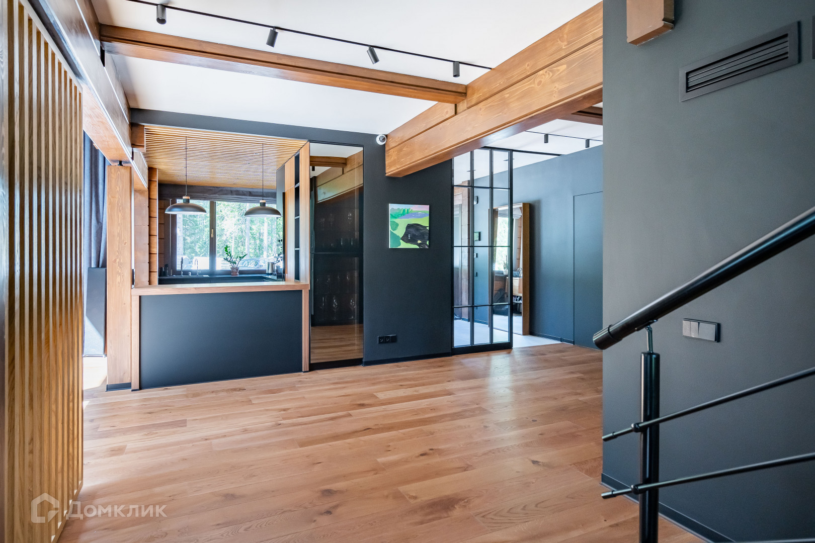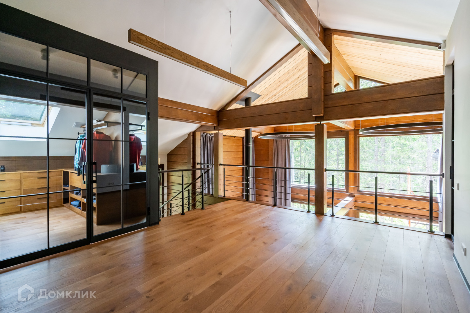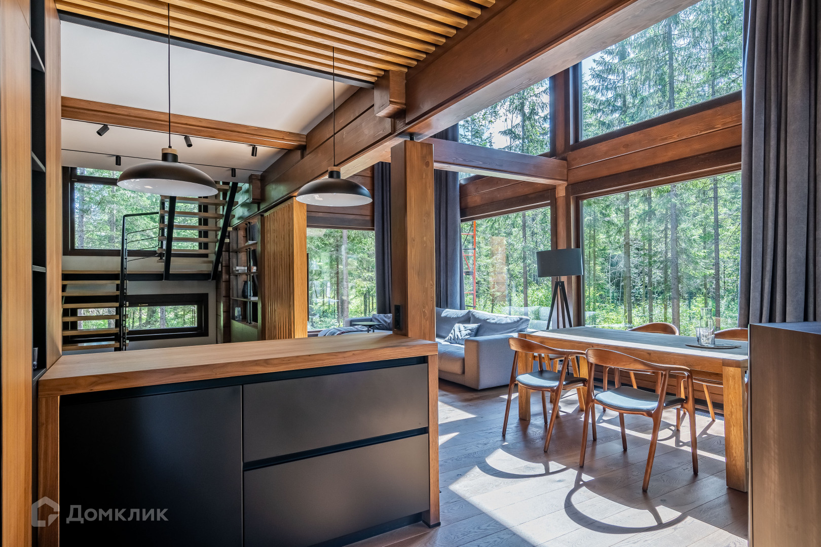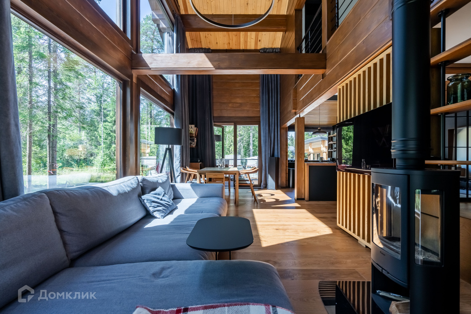 1 этаж - объемное пространство кухни-гостиной со вторым светом (вид окон на заповедник), кабинет, тех помещение, сан узел с сауной