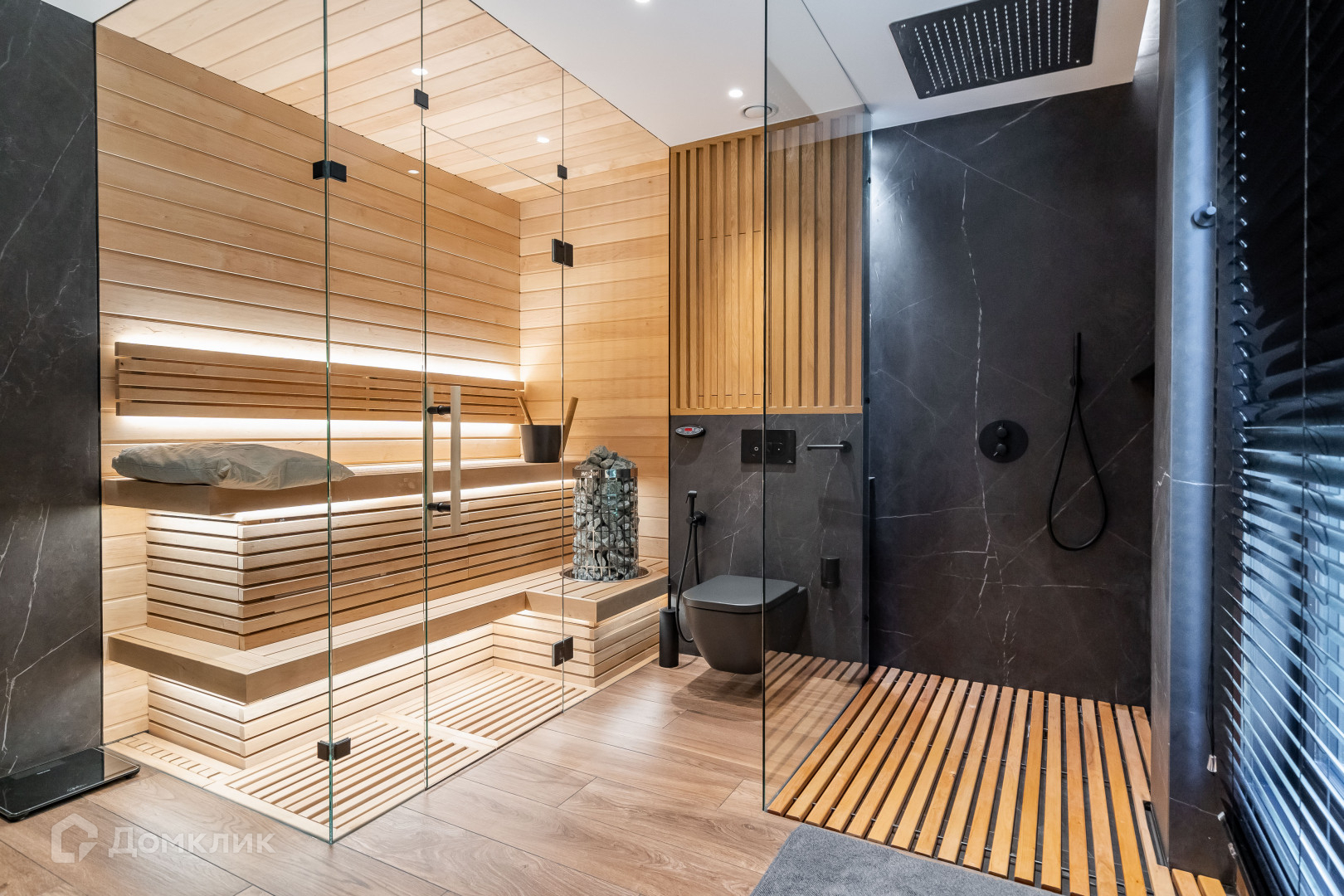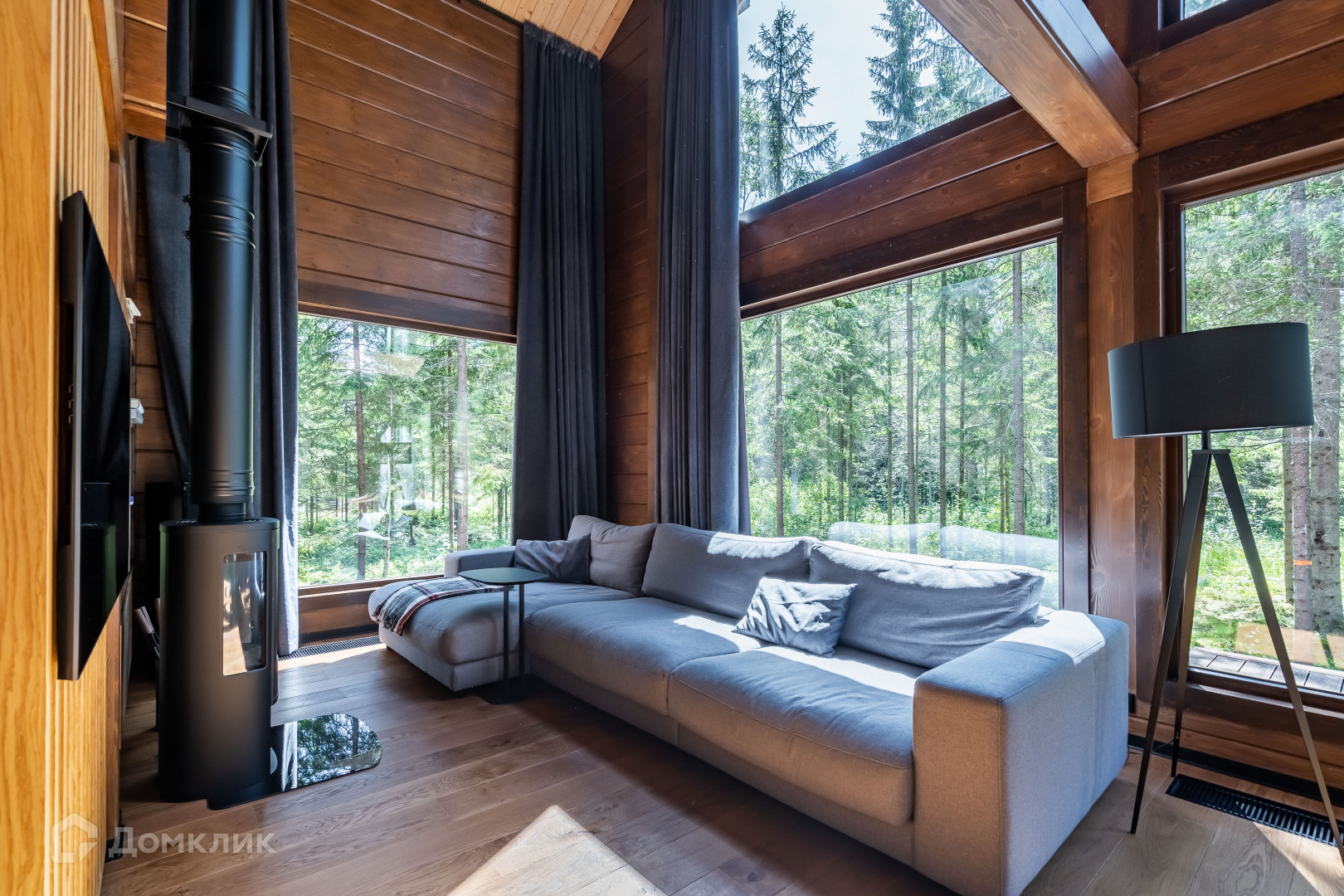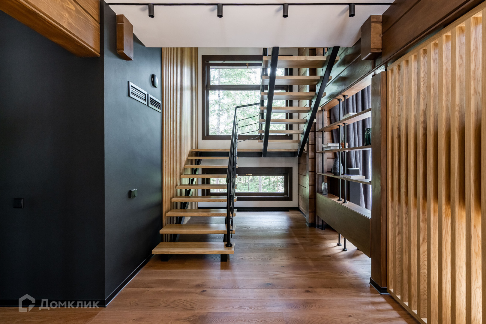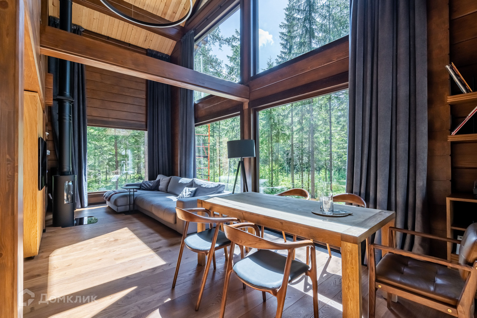 1 этаж - объемное пространство кухни-гостиной со вторым светом (вид окон на заповедник), кабинет, тех помещение, сан узел с сауной