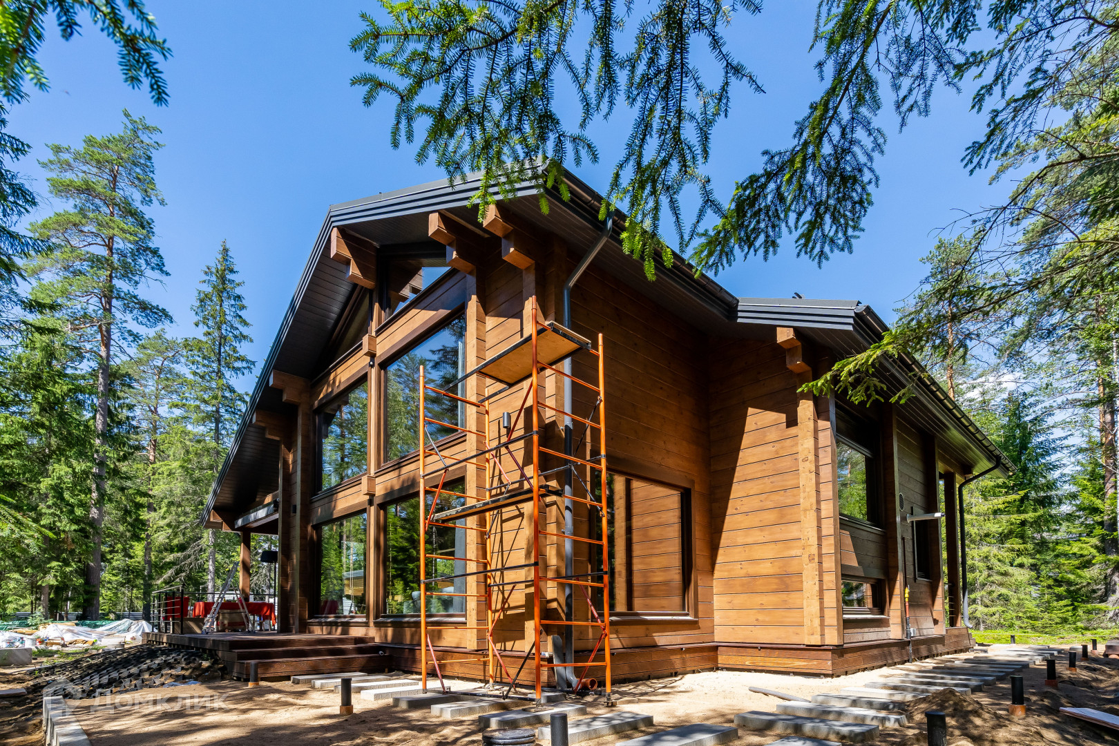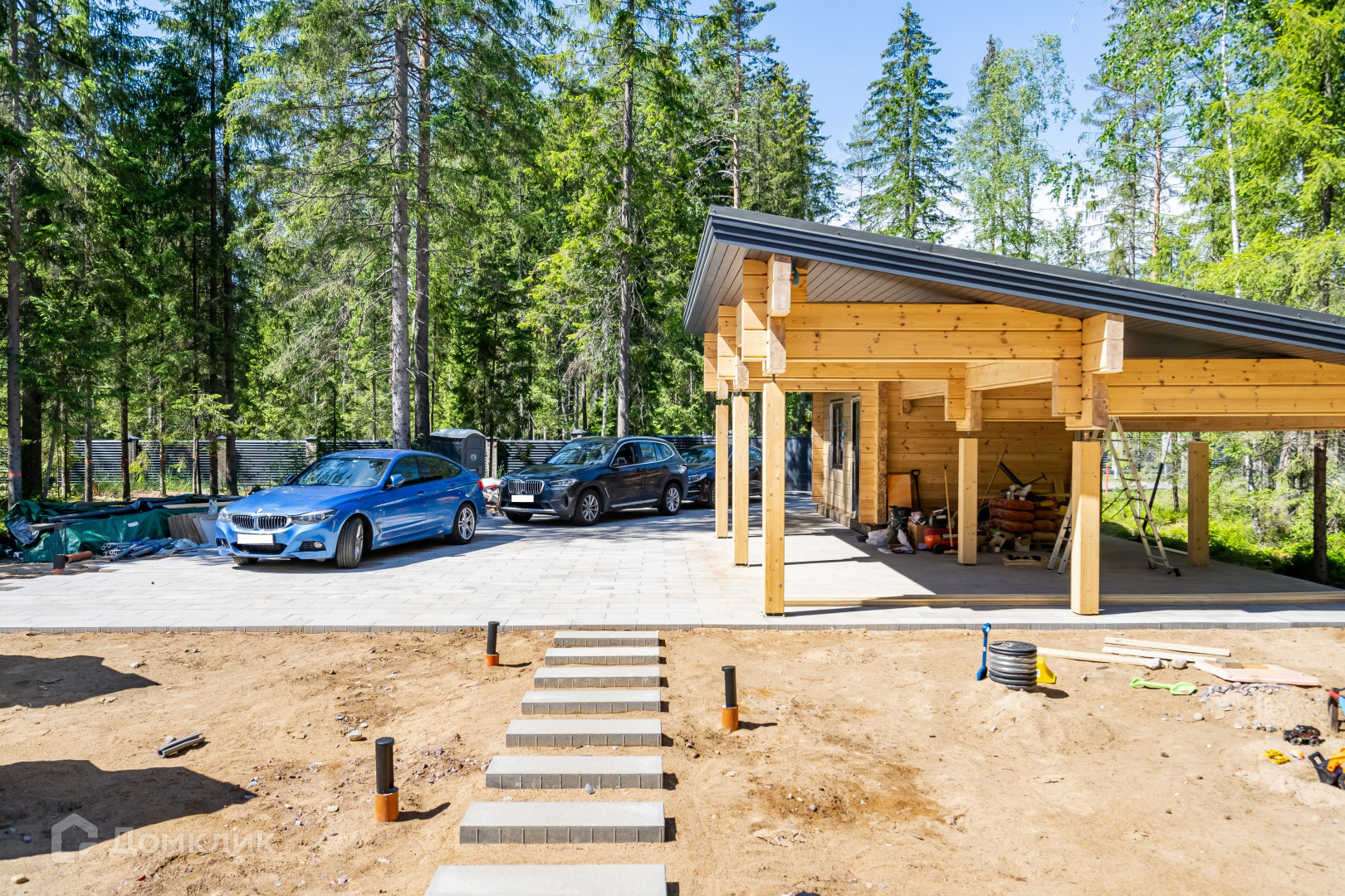 На участке завершается формирование ландшафтного дизайна. Уже сделана подсветка, уличный подогрев земли для таяния снега  зона дорожки к дому и парковки. На территории построен навес на два автомобиля совмещенный с хоз блоком.