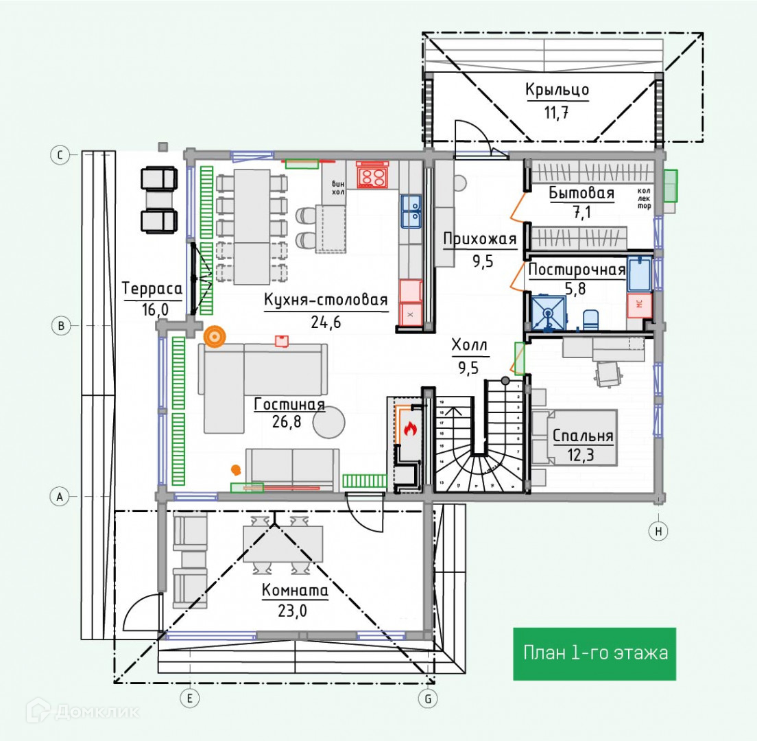 На первом этаже расположены: гостиная 26,8 м², кухня-столовая 24,6 м², комната отдыха 23,0 м², спальня 13,3 м², гардеробная 7,1 м², санузел 5,8 м², прихожая 9,5 м² и холл с лестницей 9,5 м².