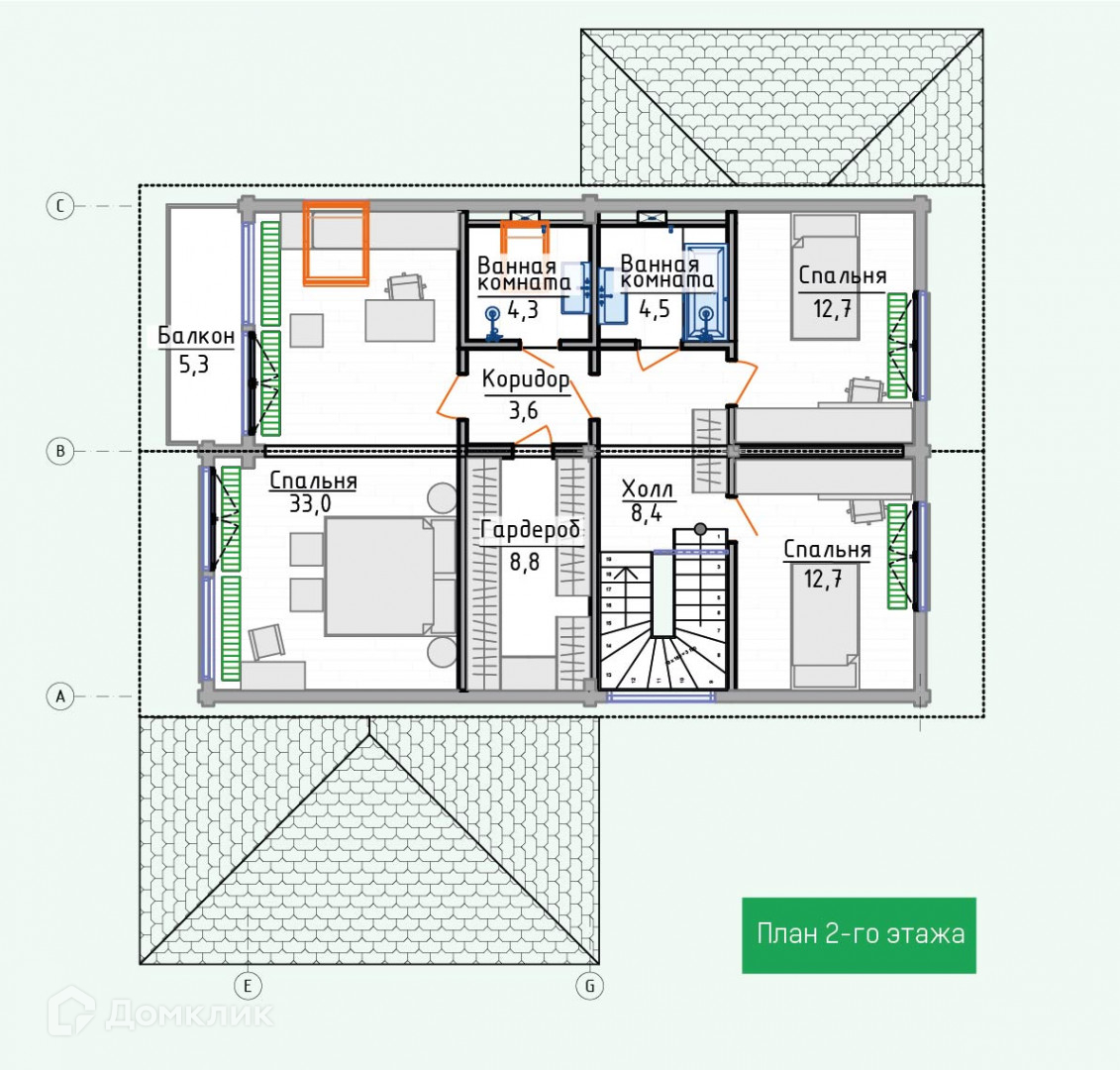 На втором: мастер-спальня 33,0 м², гардеробная 8,8 м², две детских спальни 12,7 м² + 12,7 м², две ванные комнаты, коридор 3,6 м².