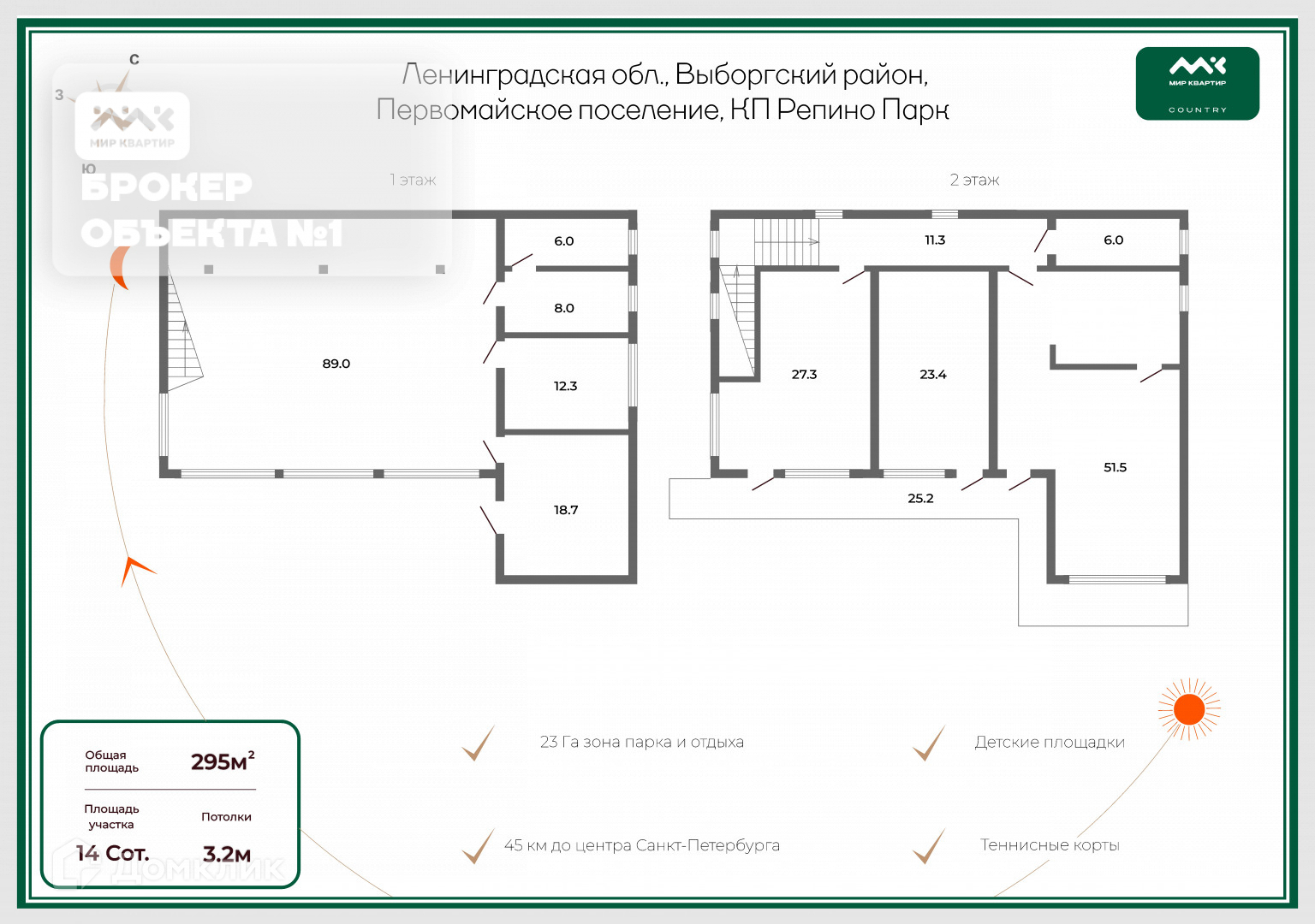 Поселок находится на границе с п. Ленинское, 23 ГА занимают зоны отдыха и общественное пространство! Здесь создана вся необходимая инфраструктура для жизни и полноценного семейного отдыха на природе: 12 детских площадок и игровых городков для разных возрастов, прогулочные аллеи, велосипедные и беговые дорожки, площадка для дрессировки собак, летнее кафе, искусственное озеро, спортивные площадки (теннис, футбол, баскетбол), настольный теннис, беговые лыжи и многое другое.