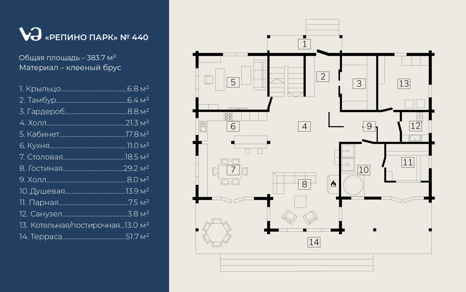 — дом общей площадью 348.6 м² из Российского клееного бруса;