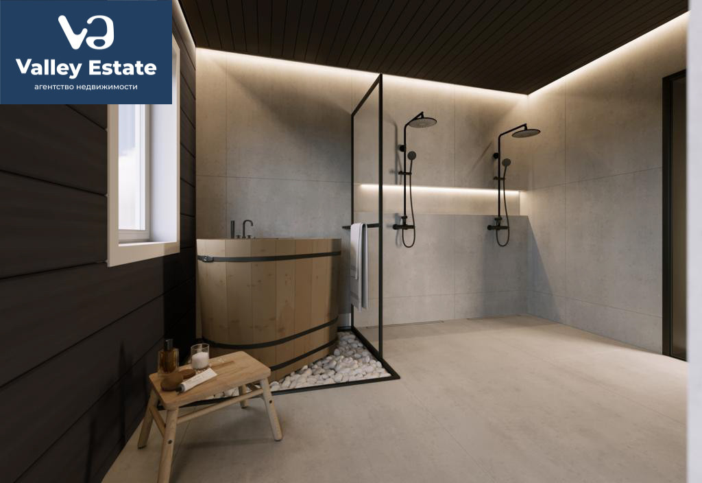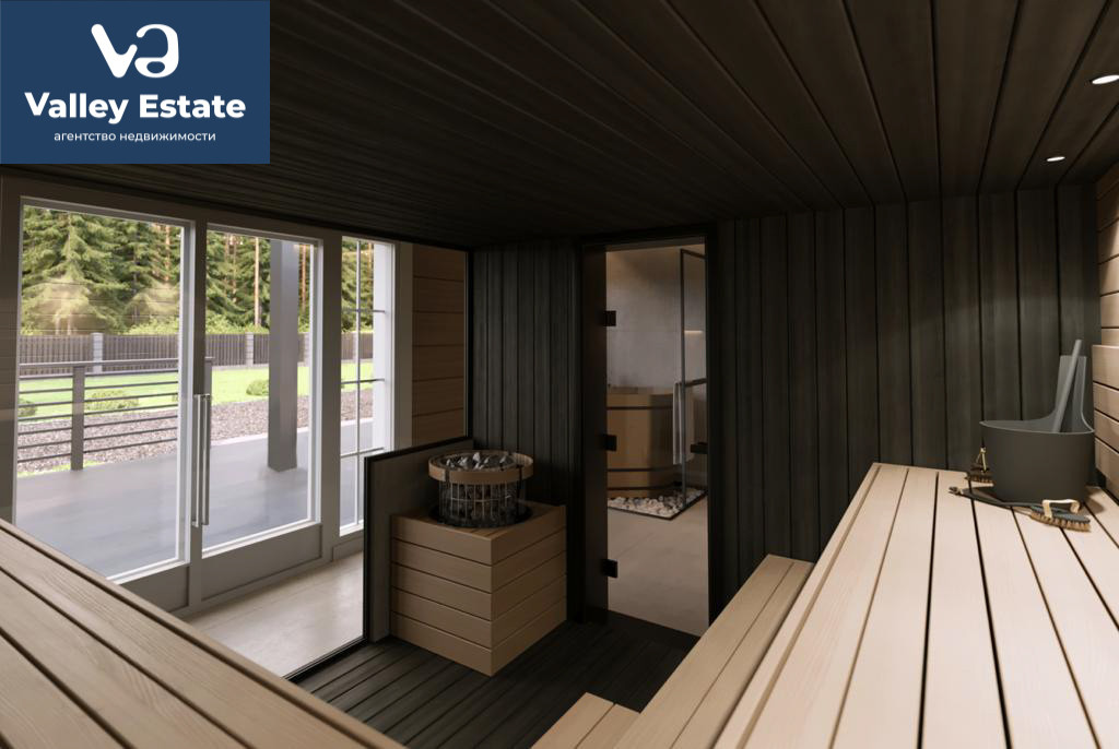 Внутреннее пространство спланировано максимально функционально: на первом этаже разместились кухня-столовая, гостиная, кабинет, хозяйственные помещения и просторная парная, а на втором этаже – три большие уединенные спальни.