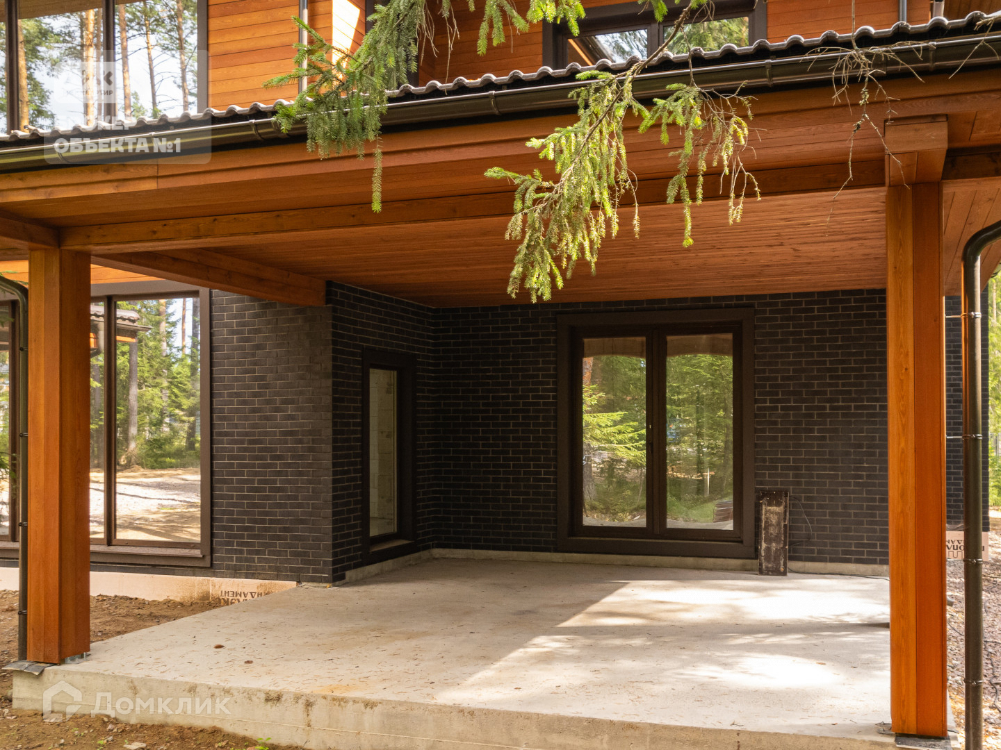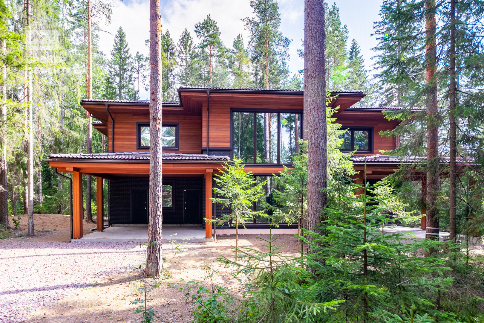 Красивый и гармоничный в своем архитектурном решении дом полностью вписан в природный ландшафт хвойного леса. В отделке фасада и крыши использованы качественные премиальные материалы.