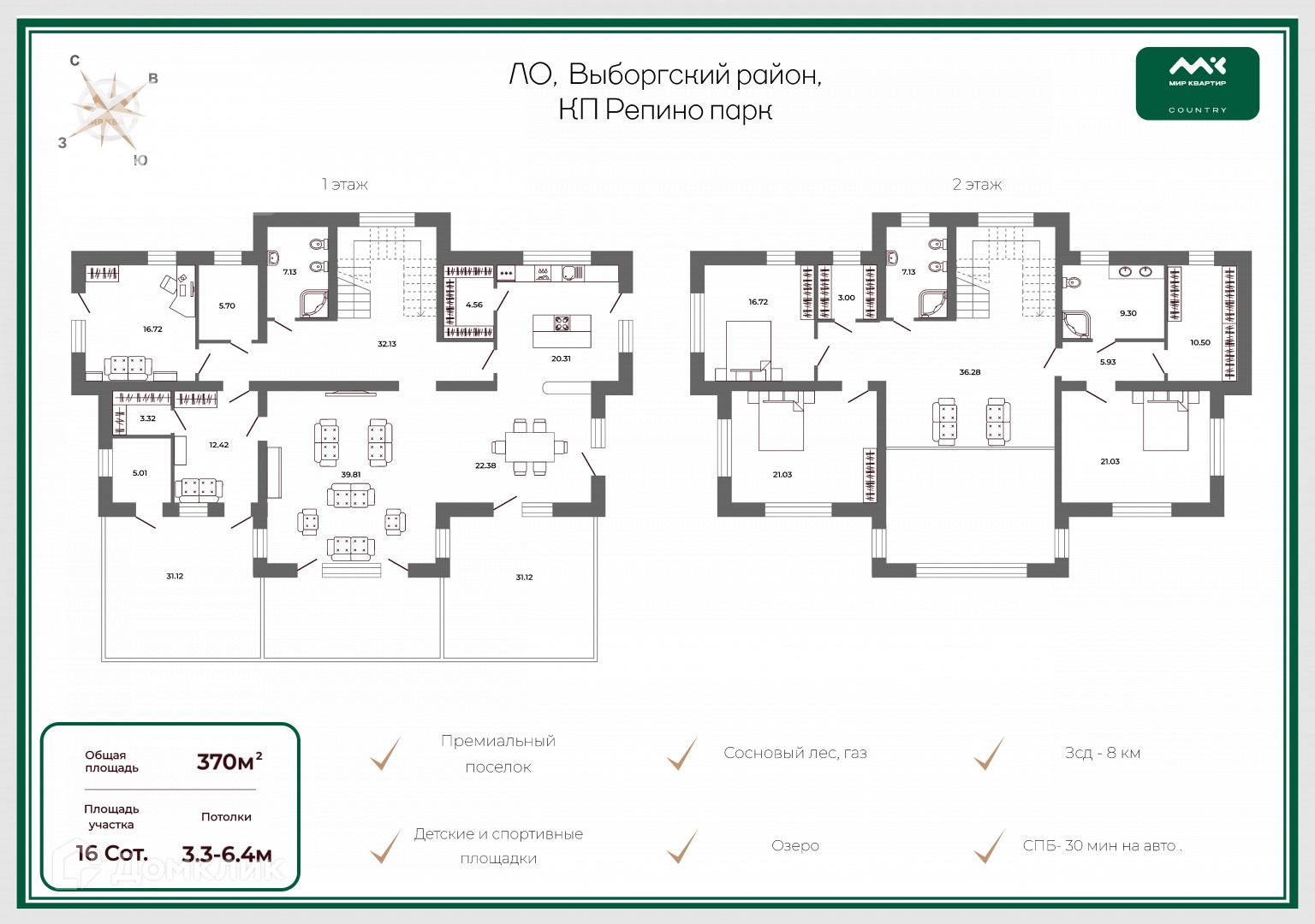 На 2 этаже расположены: основная мастер-спальня (21 кв.м) с просторной ванной 10 кв м и гардеробной 10 кв.м, 2 детские спальни с гардеробной и своим с\у, просторный холл с панорамными окнами в лес.