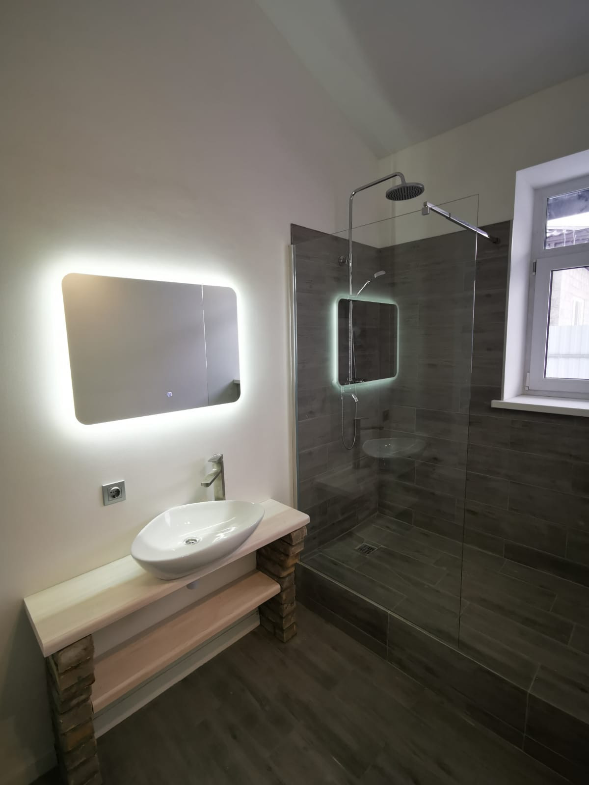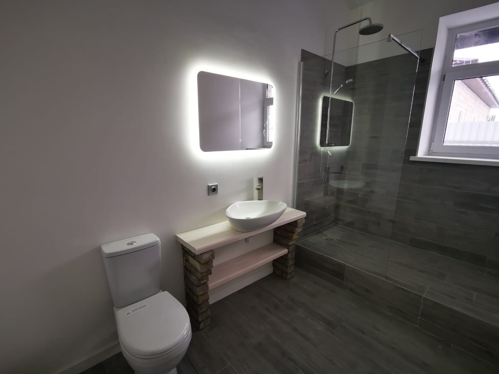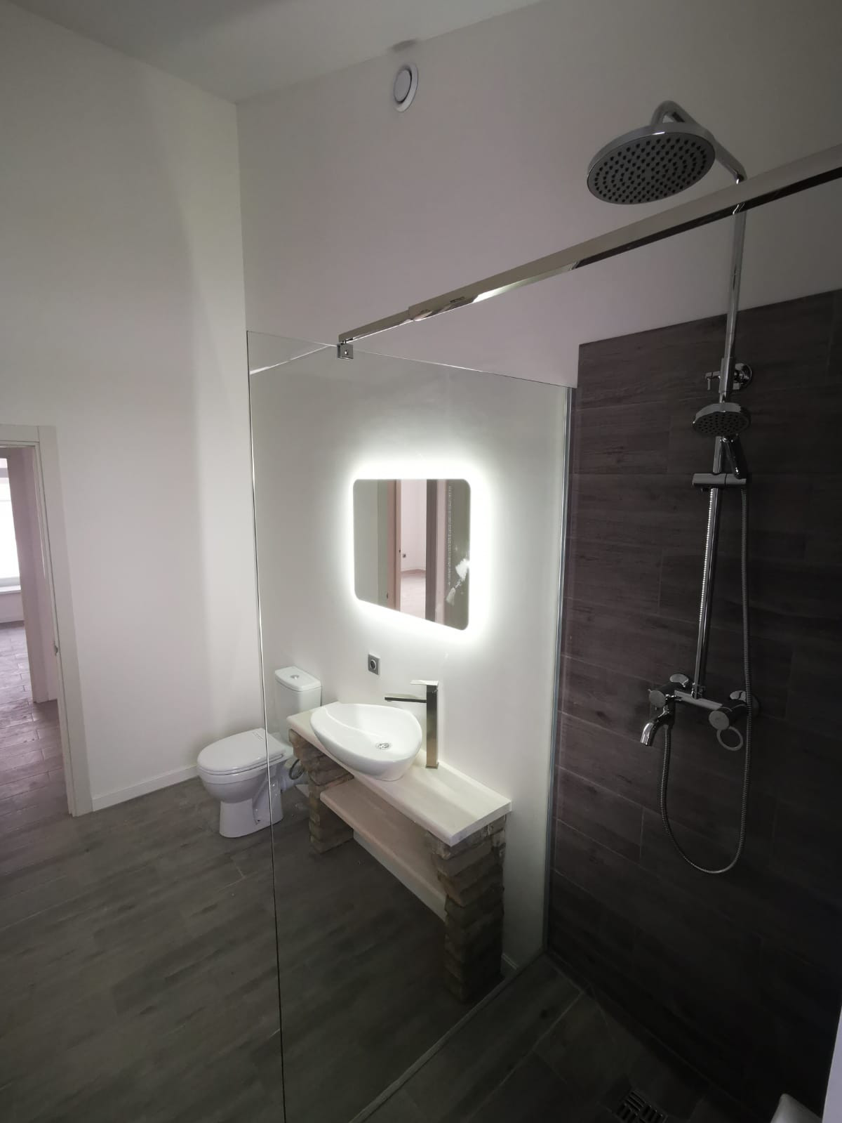 Смонтировпны тропический душ, раковина и унитаз. Все готово к эксплуатации.