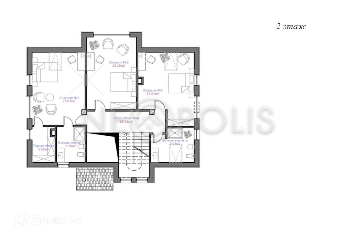 2 этаж: холл, мастер спальня с гардеробной и ванной комнатой, 2 спальни, санузел.