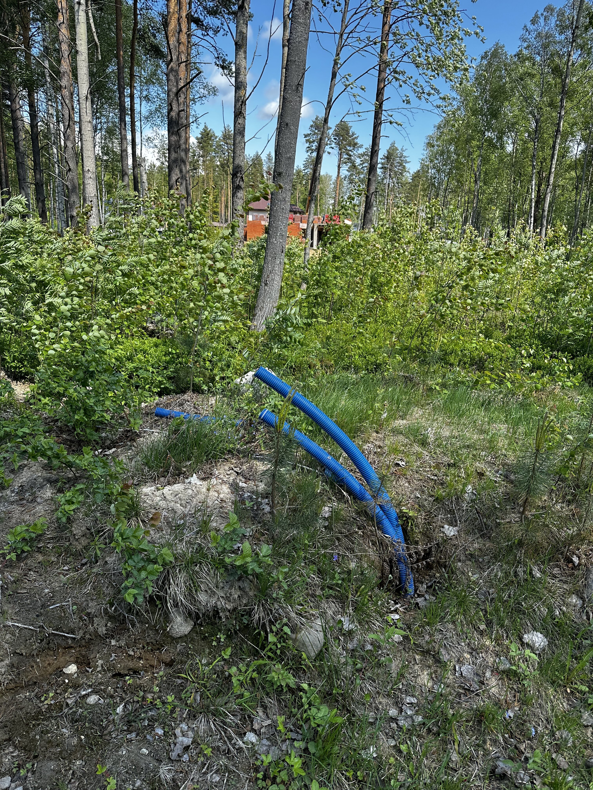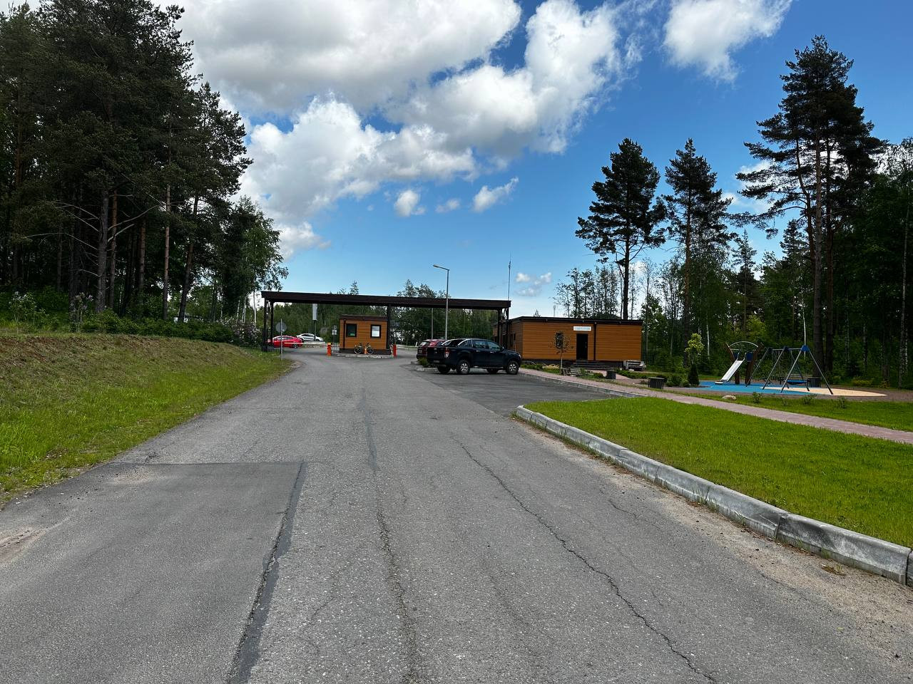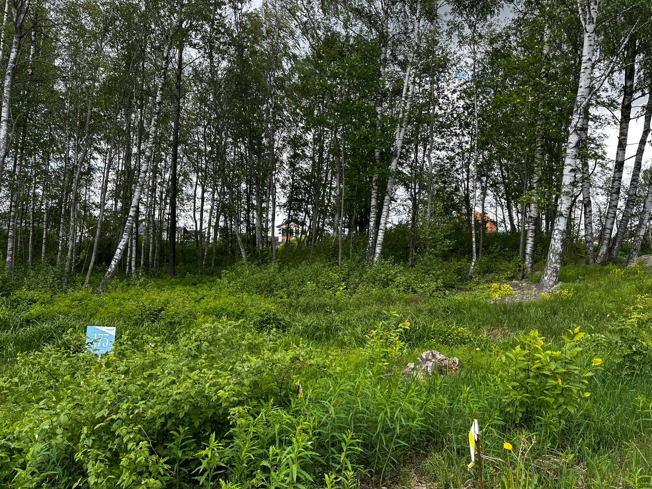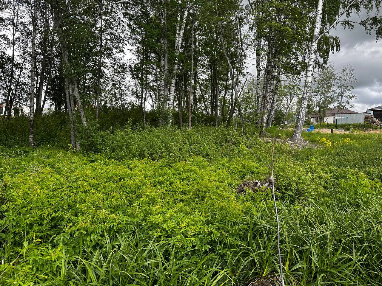 Участок в непосредственной близости от въезда в посёлок. Два соседа. На участке растут деревья.