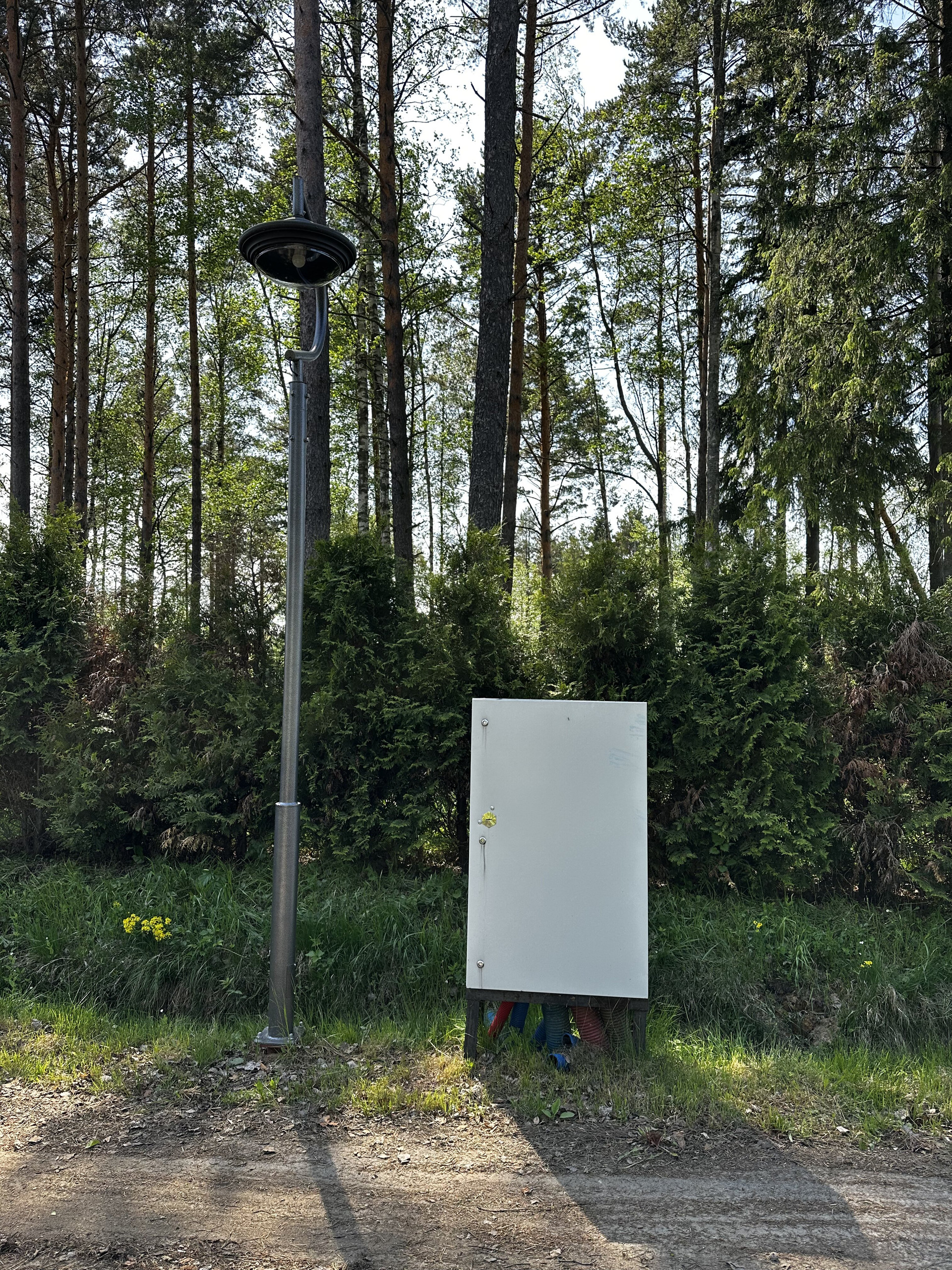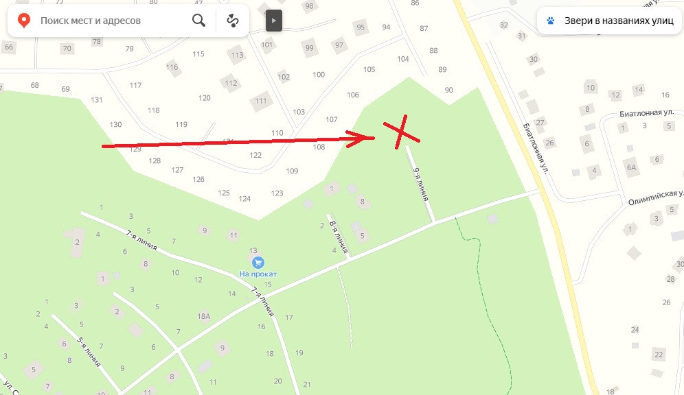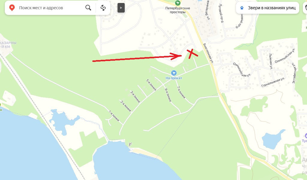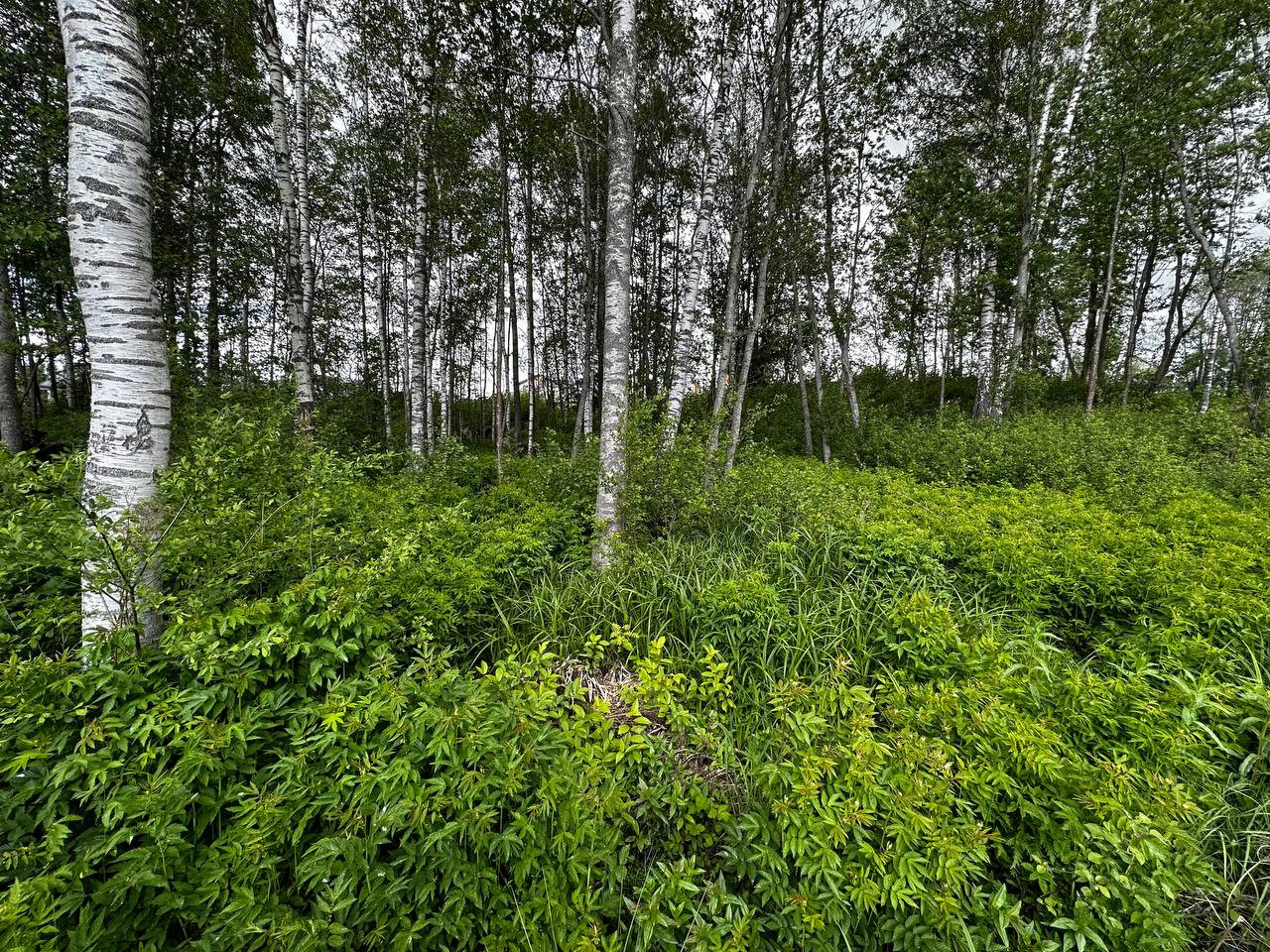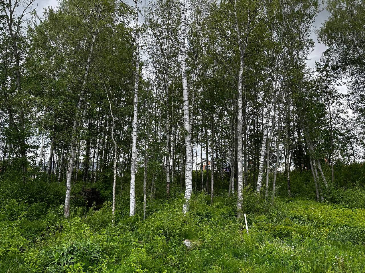 Участок в непосредственной близости от въезда в посёлок. Два соседа. На участке растут деревья.