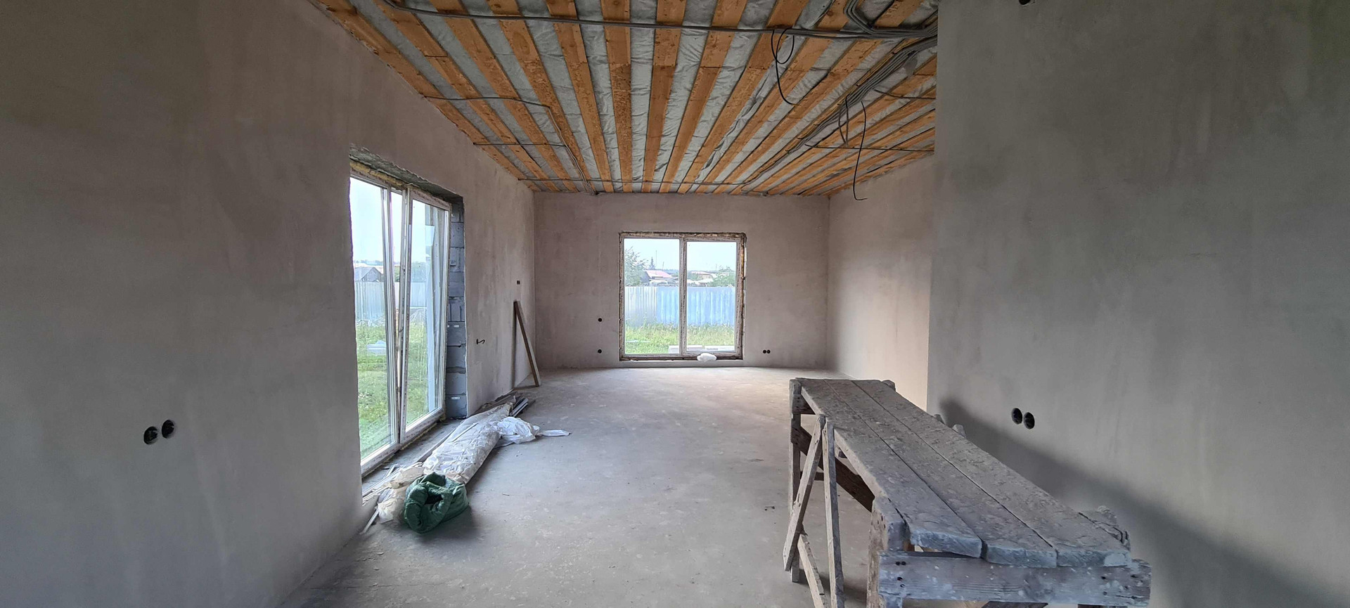 1 этаж: тамбур, прихожая, отдельная котельная, совмещенная гостиная с кухней 45 кв.м., три спальни около 13 кв.м., 2 сан.узла, терраса открытого.