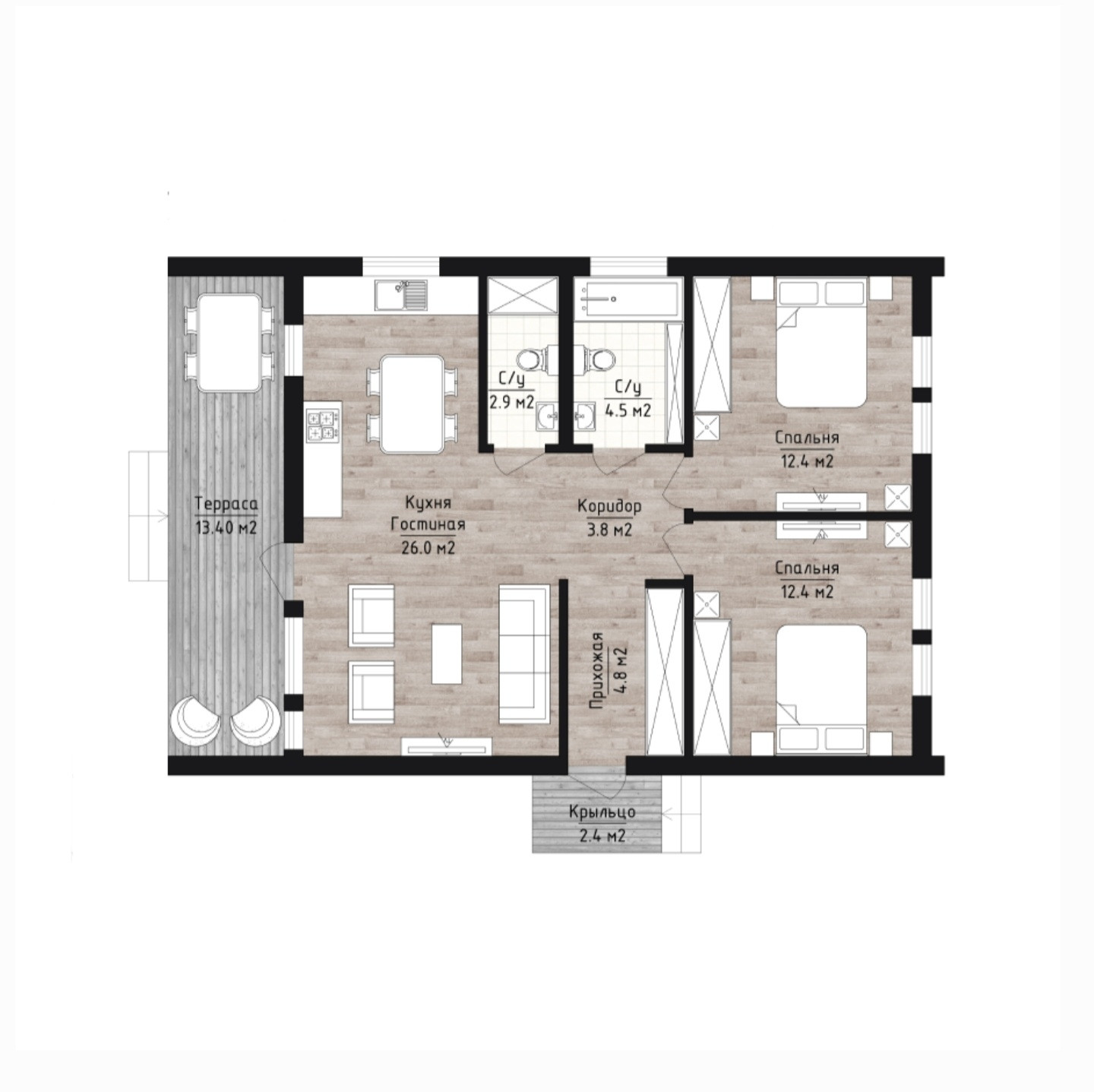 ▪ Сантехника внутренняя — скрытая, сшитый полипропилен, выводы под водоразбор