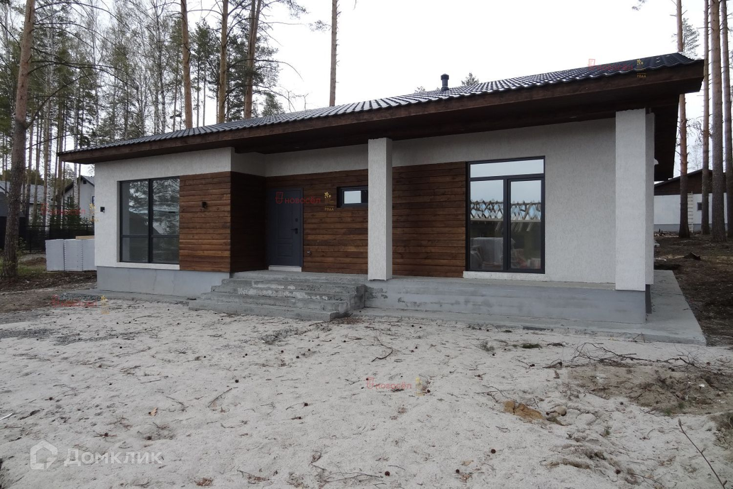 Дом из газобетона 300 мм с утеплителем, снаружи отделка декоративной штукатуркой. Кровля - металлочерепица. Всё построено и отделано высококачественными материалами и готово к проживанию. Только поставить мебель.