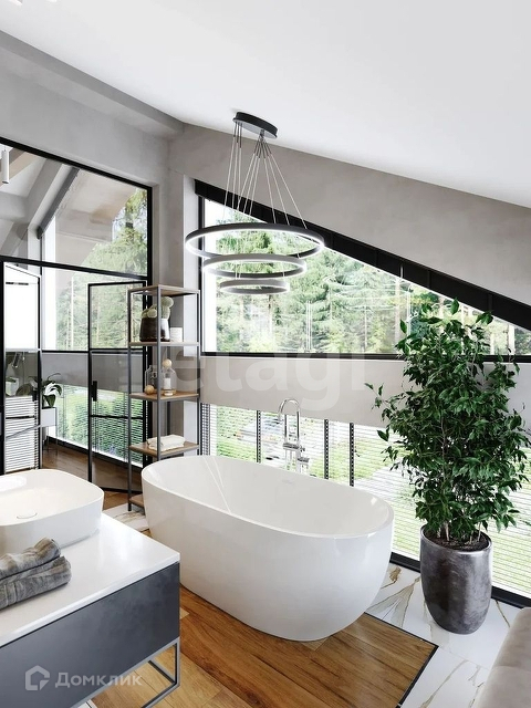 Этаж 2: 2 спальни с панорамным остеклением, с которых предусмотрен выход на большой балкон, санузел, + имеется третья, просторная мастер-спальня, с панорамным остеклением (высота потолков в верхней точке, порядка 5м.) с собственным санузлом и гардеробной.