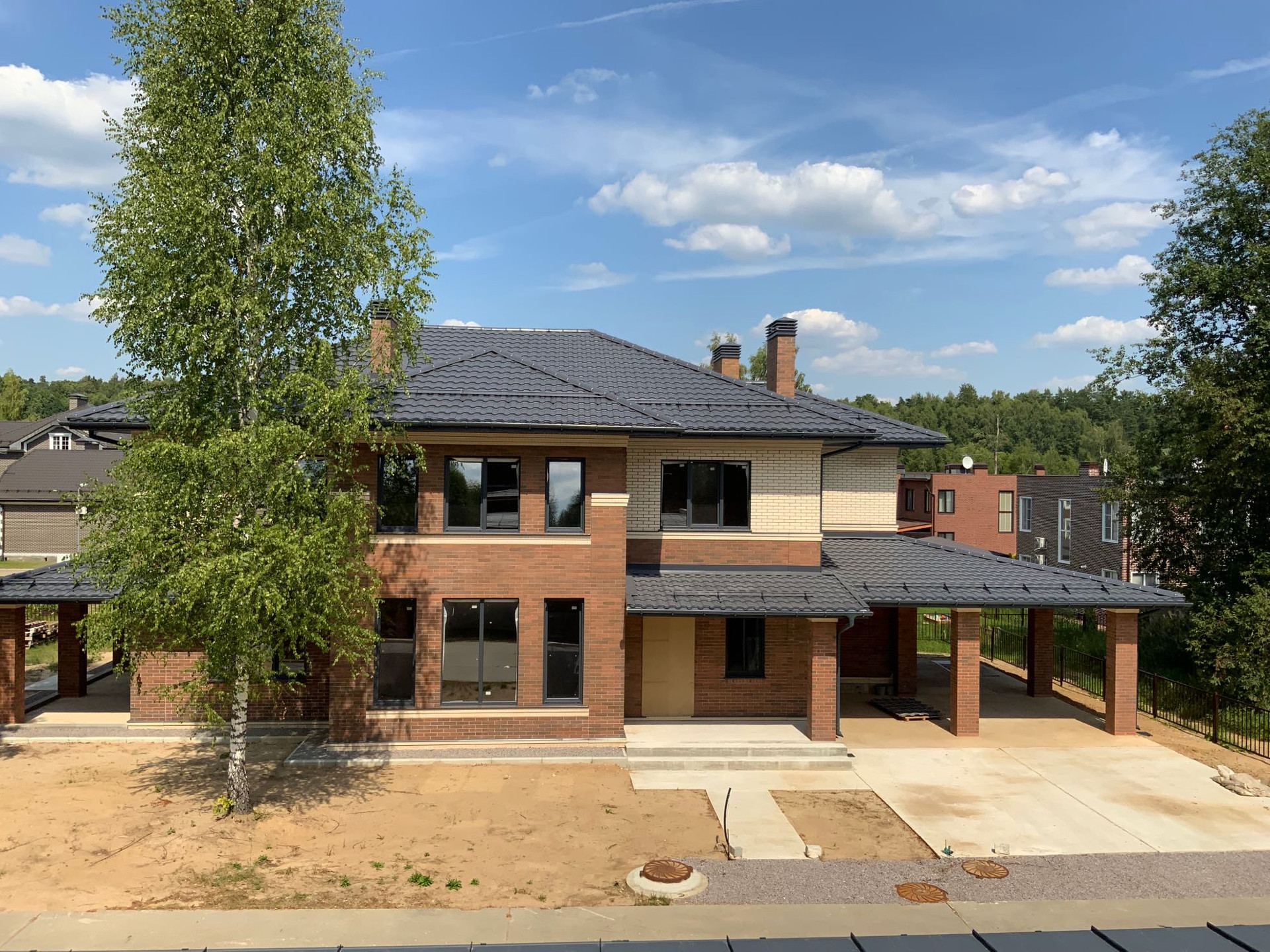 Внутренние и наружные стены полностью построены из глиняного керамического облицовочного кирпича. Толщина стен 570 из них 100 утепление. Вентиляция в доме предусмотрена под финскую систему Vilpe