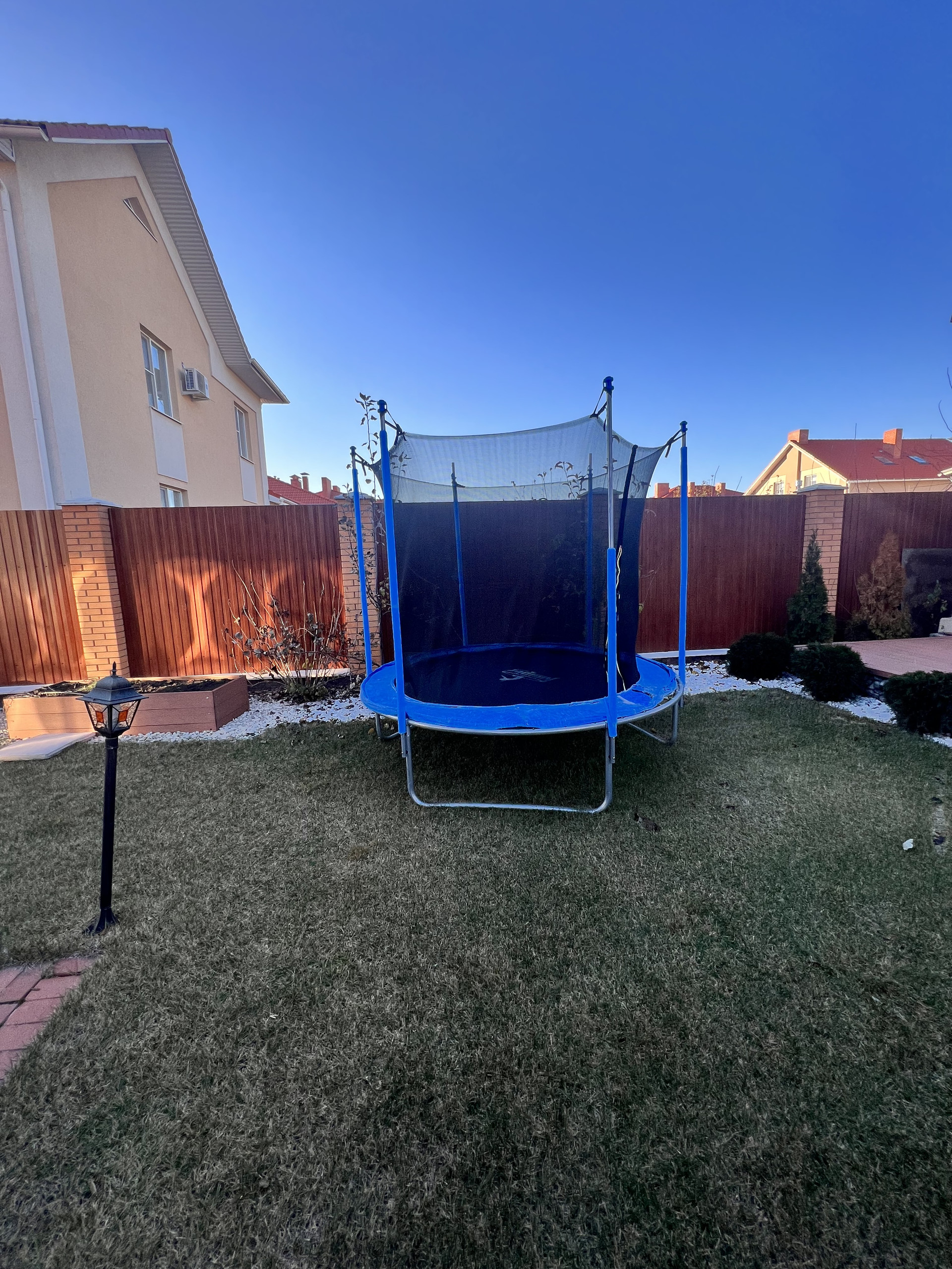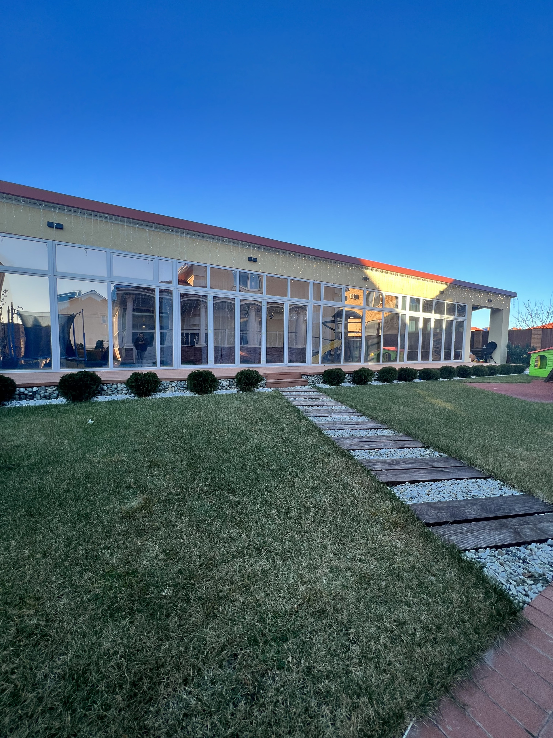 Идеальный размер участка (10 сот), выложена качественная тротуарная плитка, газон с авто поливом, декоративные камушки чтобы не было сорняков, кладовая для газонокосилки и прочего садового инвентаря.