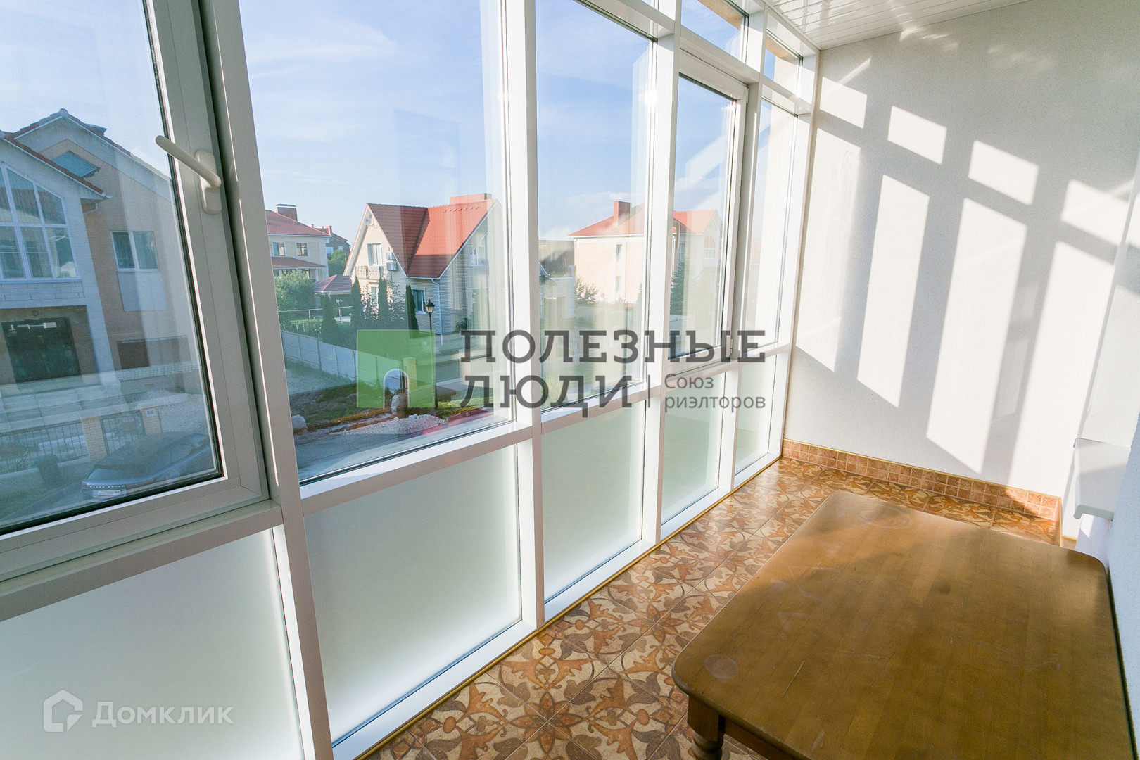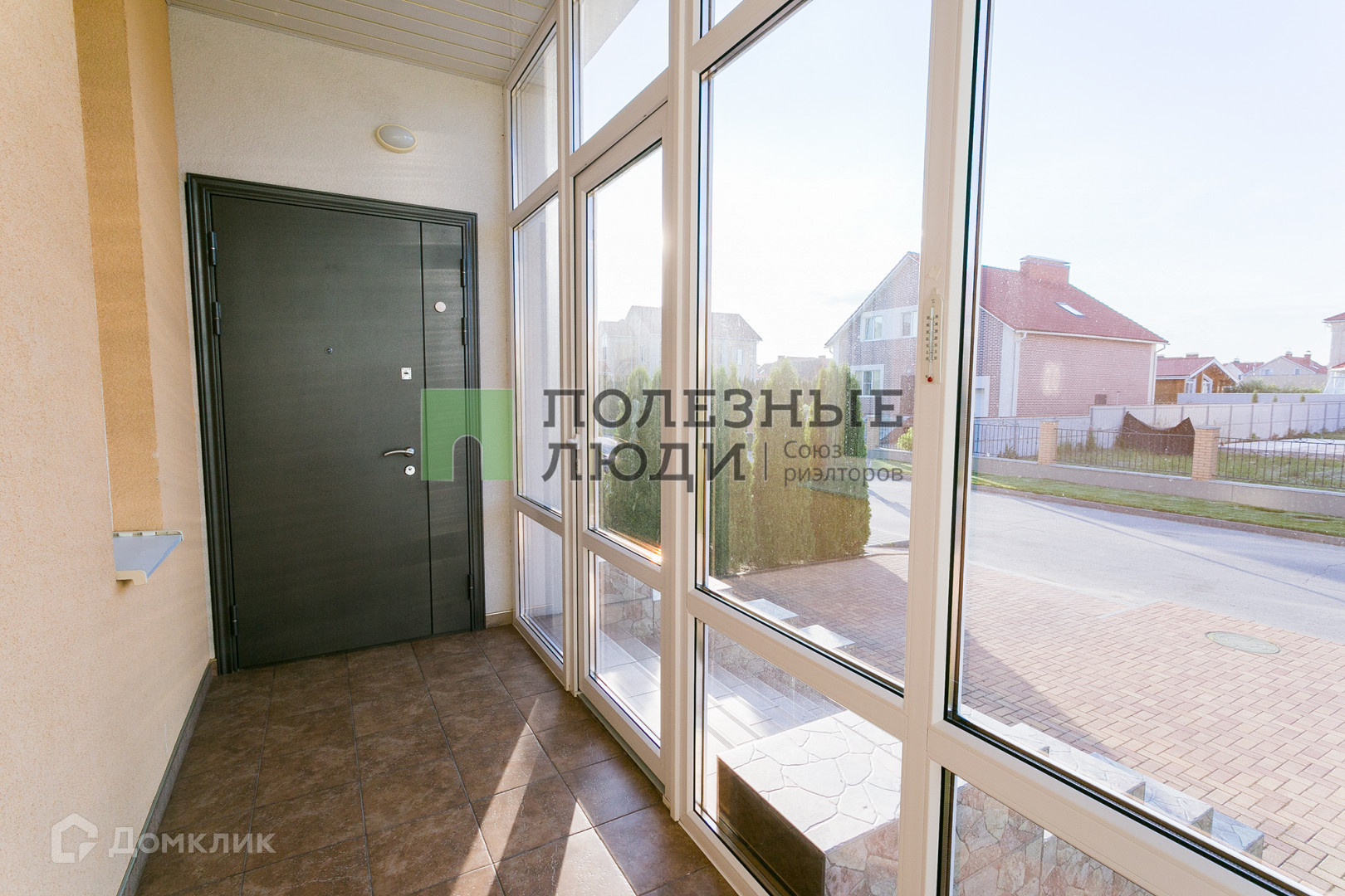 Площадка перед домом уложена брусчаткой, вход через застекленную веранду.