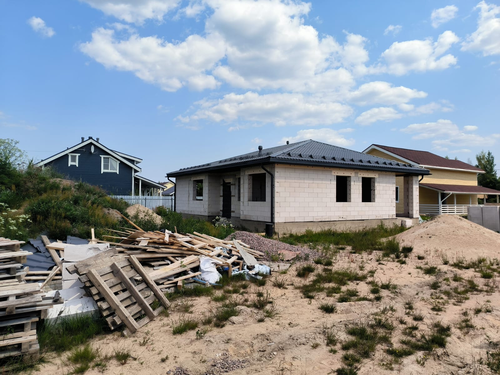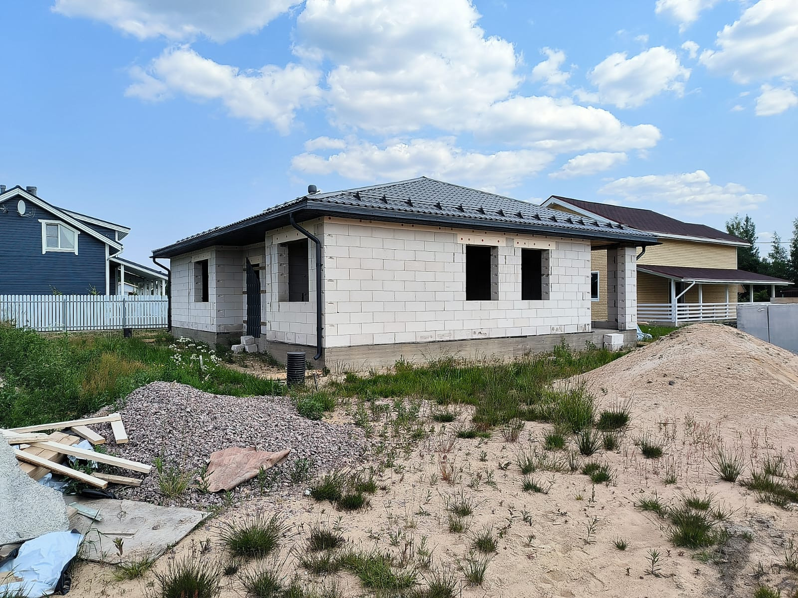 Дом стоит на ленточном фундаменте плюс плита, стены газобетон, армопояс, есть дренаж вокруг дома. Крыша металлочерепица