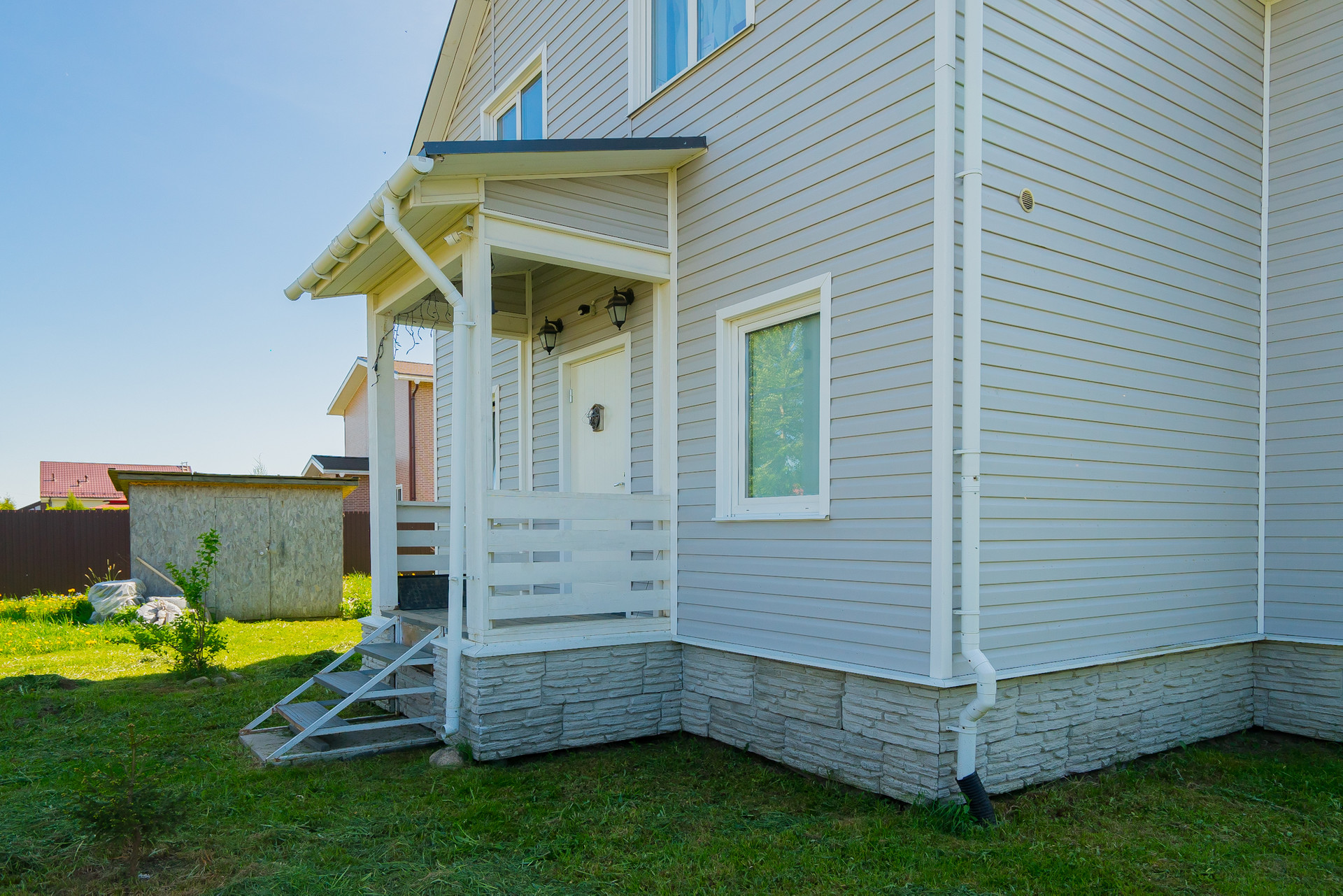 · Фундамент свайный обшит панелями под камень.