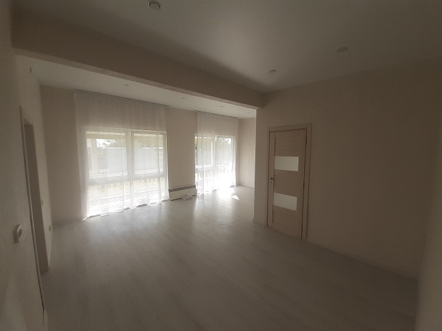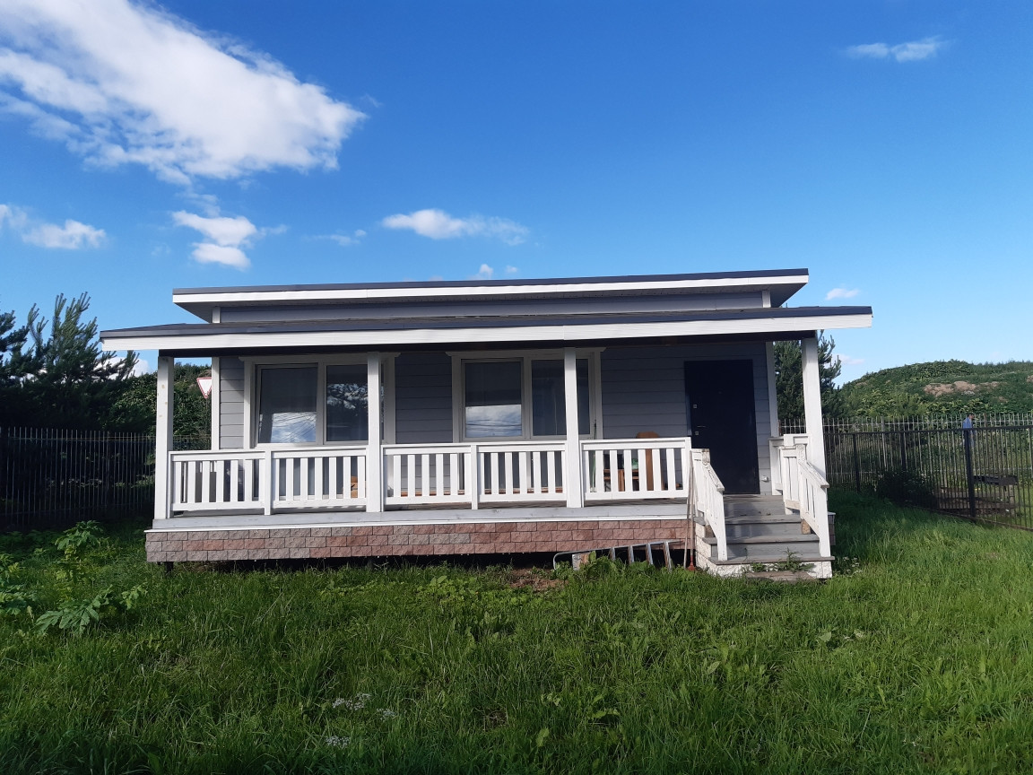 В доме большая кухня-гостинная - 37 кв.м с панорамными окнами, спальня - 7,5 кв.м, прихожая и совмещенный санузел, широкая терраса вдоль дома.