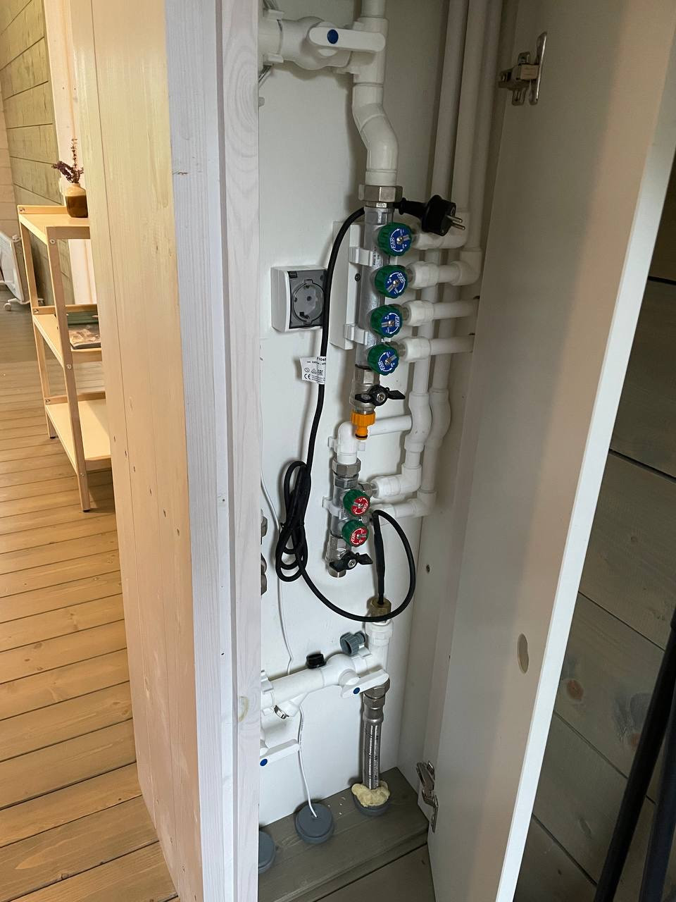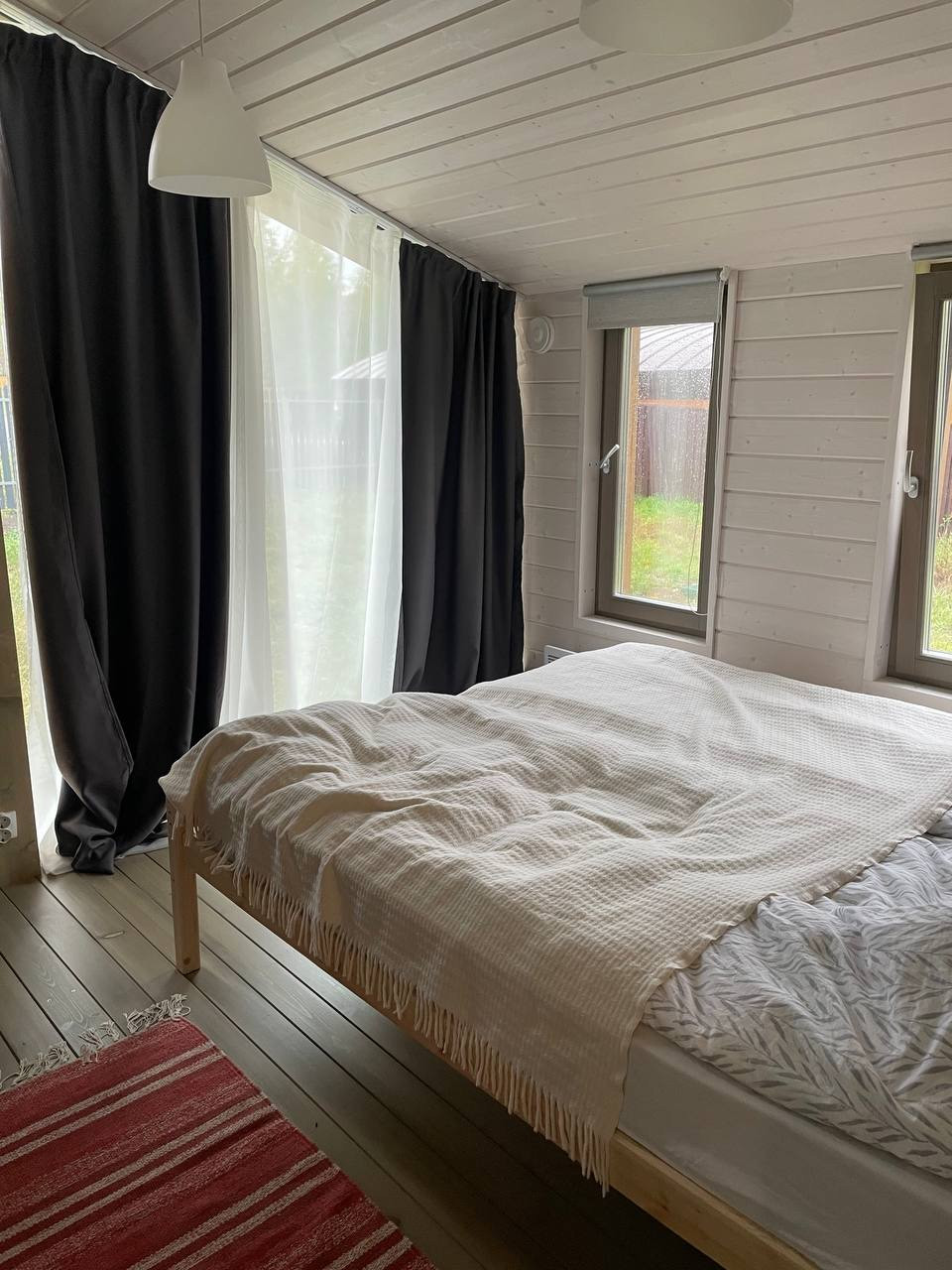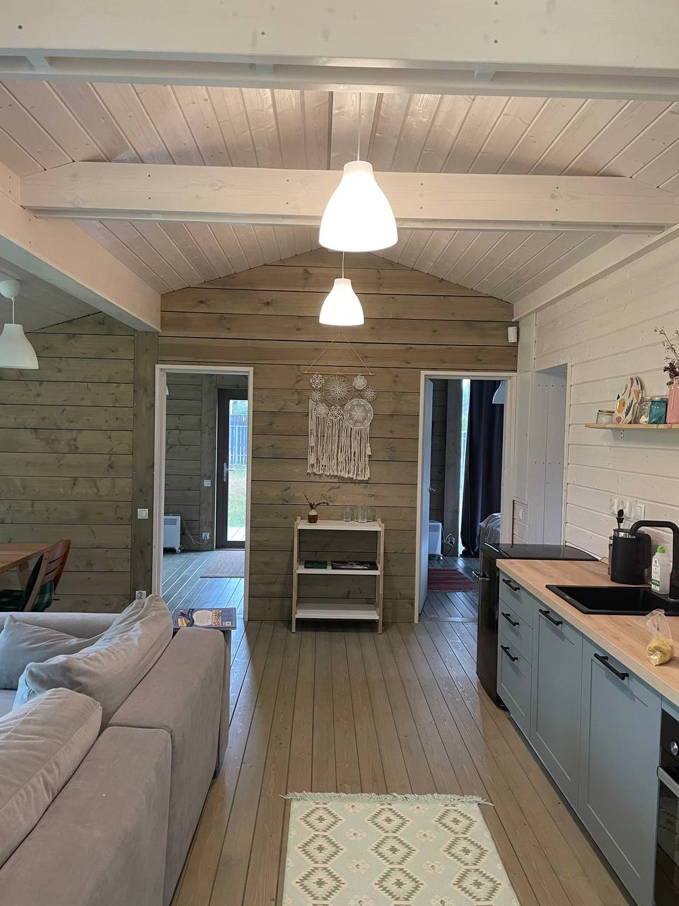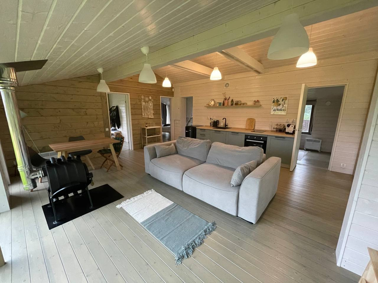- При постройке использованы натуральные и экологичные материалы. Снаружи дом отделан деревом и профлистом цвета серый графит. Внутренняя отделка – также массив дерева. Утепление – 200 мм в полу и 150 мм в стенах и крыше.