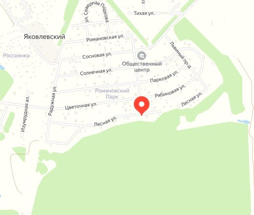 - Тульская область, Заокский район,  в 100 км от МКАД по Симферопольскому шоссе, в 15 мин пешком до ж/д платформы "Романовские дачи" Курского направления.