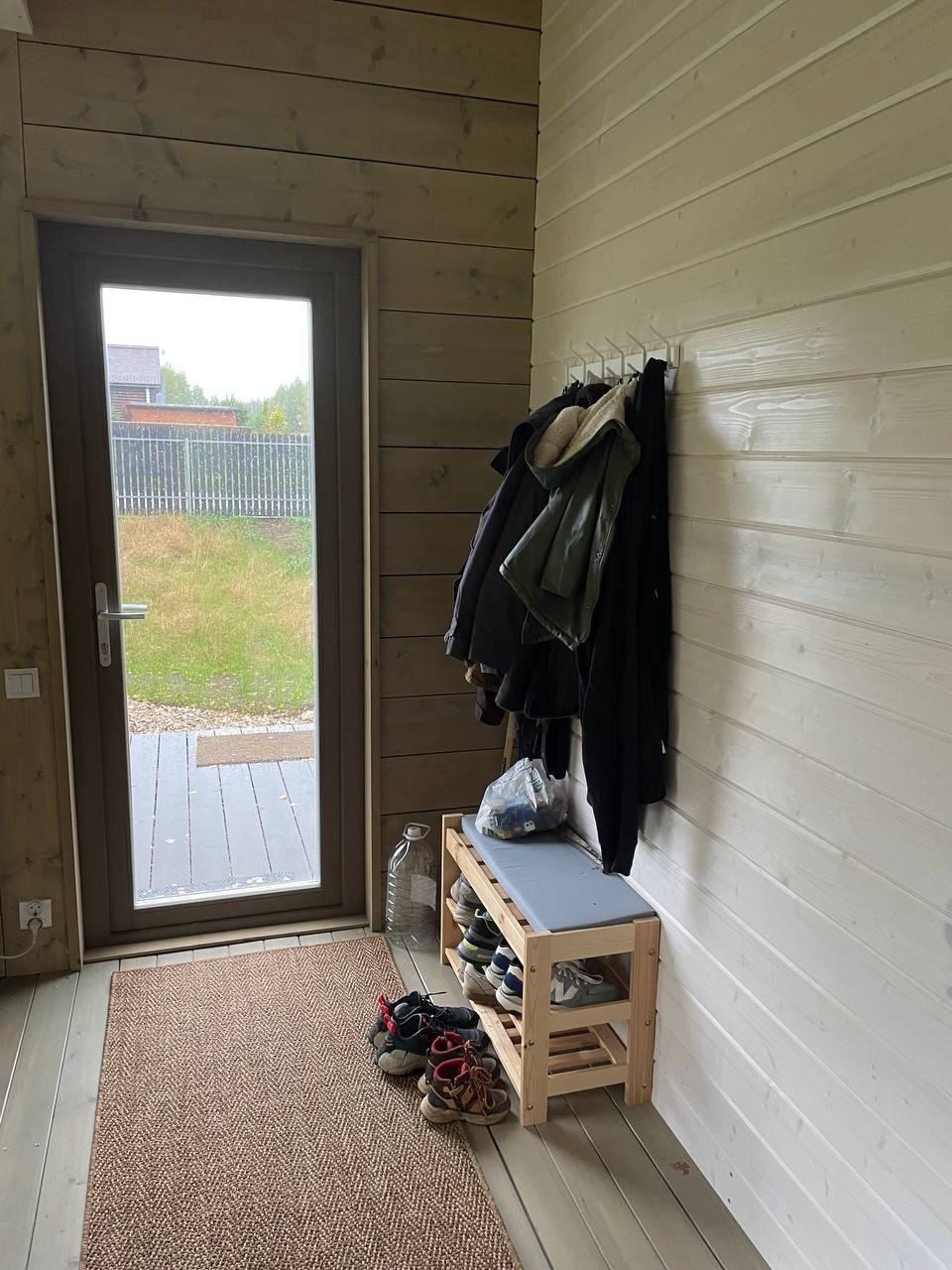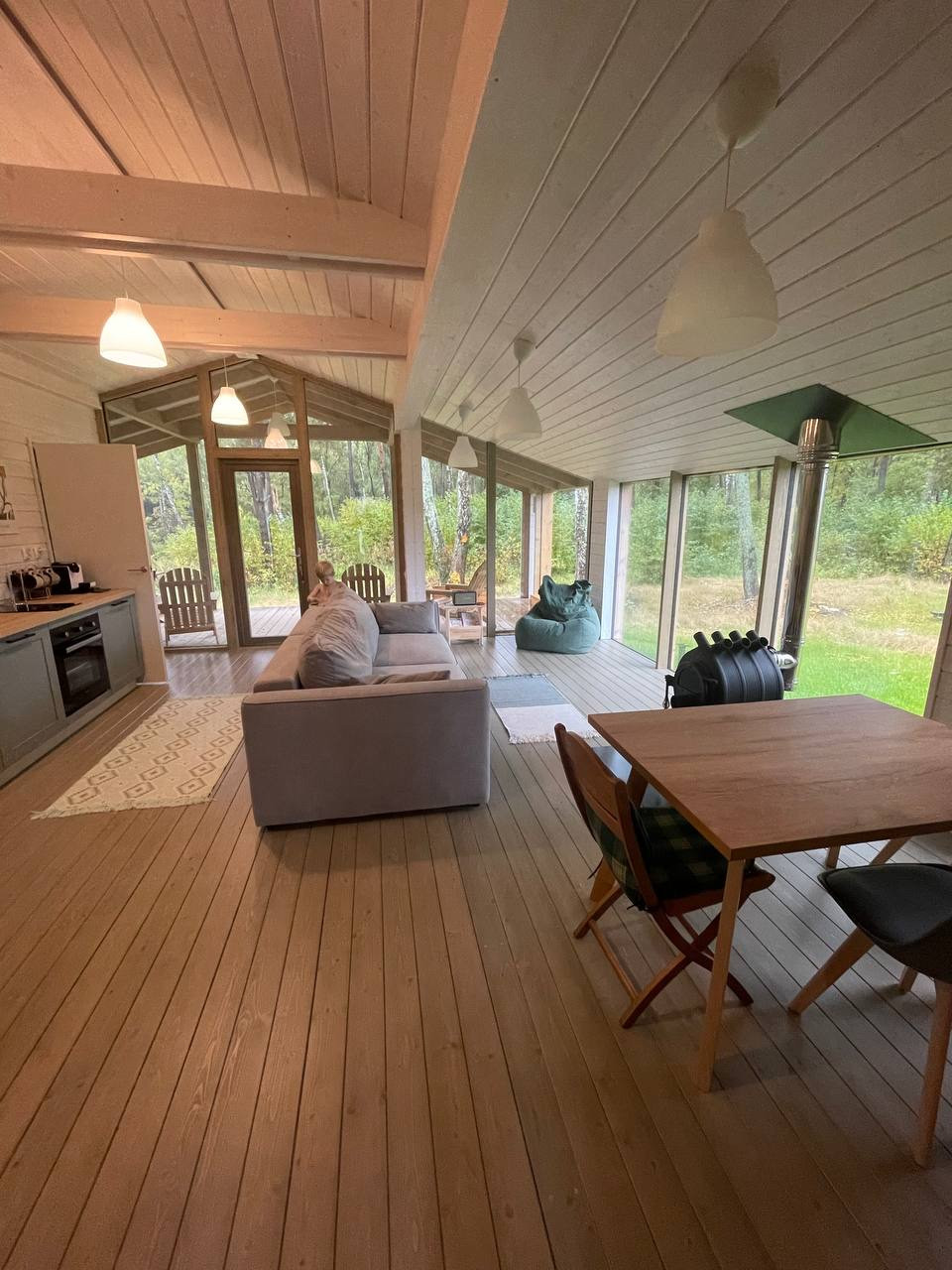 Панорамные окна  коттеджа выходят на лес. С одной стороны соседи построены, с другой пустой участок.