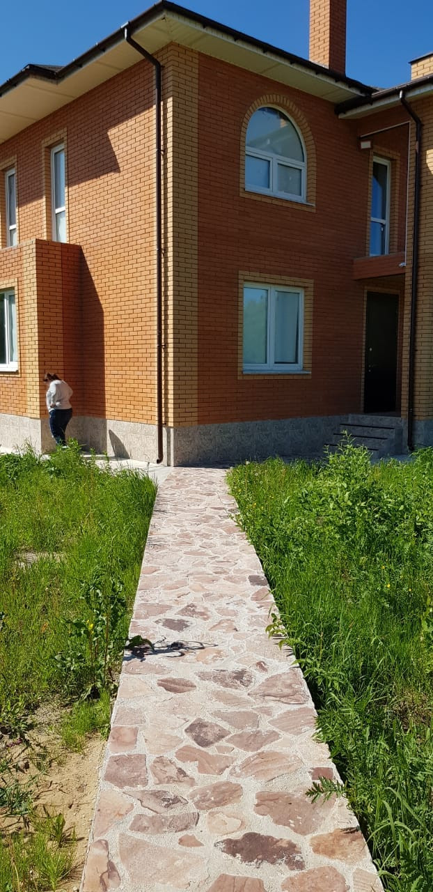 Дом двухэтажный общей площадью 196 м2, стены трёхслойные (облицовочный кирпич, утеплитель, пеноблок), кровля мягкая, окна пластиковые, перегородки из пеноблока и газосиликата, монолитная лестница.