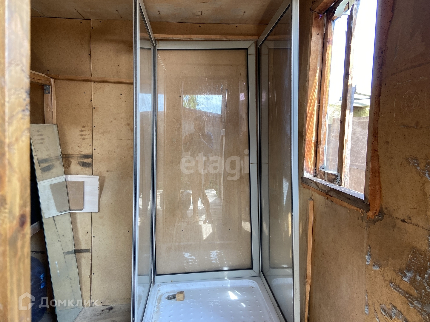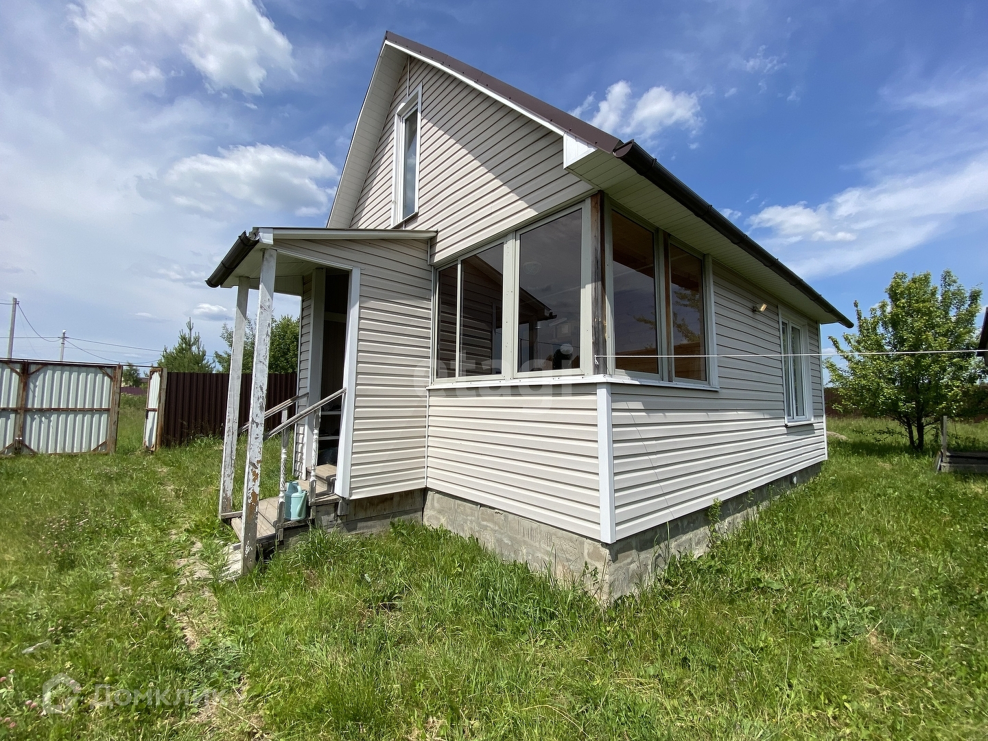 Каркасный, утеплен, обшит сайдингом, на блоках.