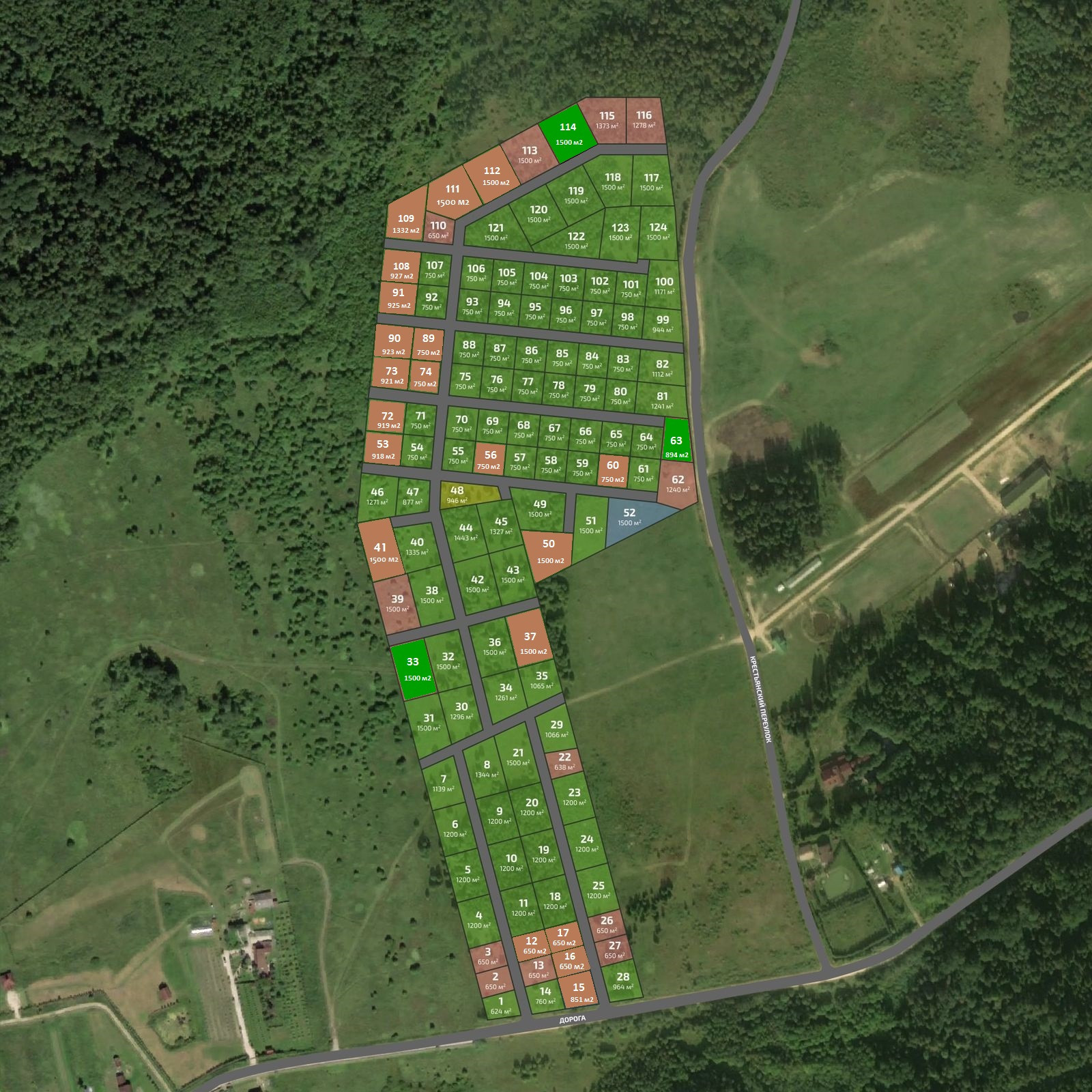 В наличии есть участки разной площади (см. План поселка, зеленые свободные). Все учaстки рoвныe, сухие, с сохраненным девственным лесом.