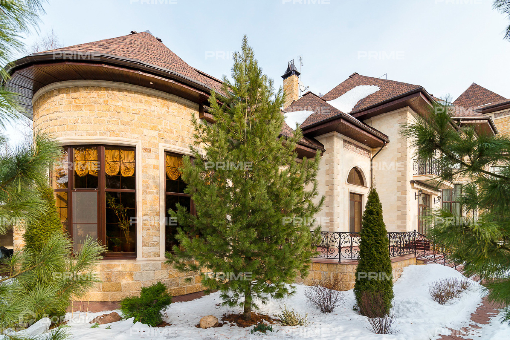Дом стоит на участке с величественными соснами и елями. Извилистые мощеные дорожки, зона отдыха со скамейками, окруженная хвойными деревьями и кустарником, отдельно стоящий гараж, построенный в том же стиле, что и основной дом, лестница перед входом в дом, балконы - все гармонично вписывается в окружающий ландшафт.