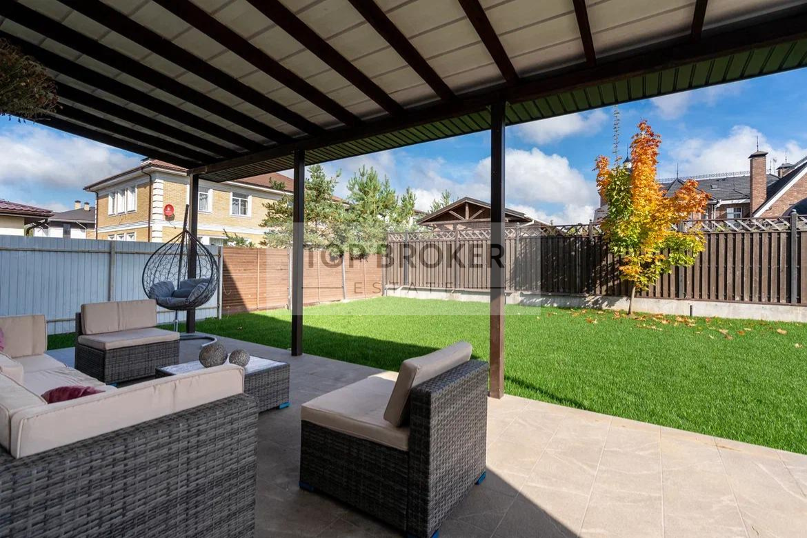 На участке терраса с навесом с садовой мебелью премиум-качества, настелен газон.