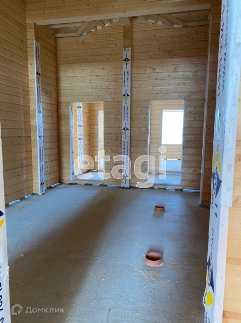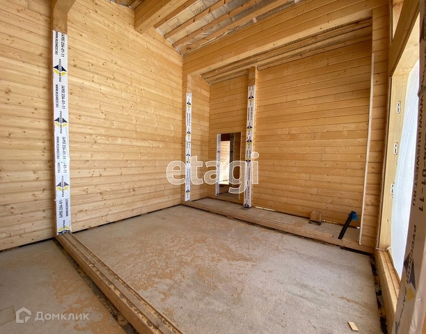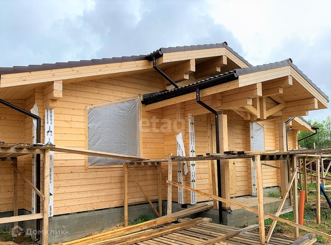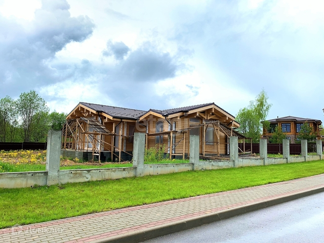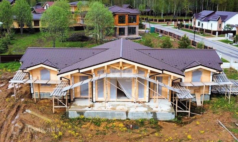 ДОМ: материал стен - клееный брус, без отделки, спроектирован по типу «дуплекс»: 4 комнаты, одна гостиная, 2 кухни по 12 кв метров, 2 санузла, 2 гардеробных комнаты, открытая терраса.