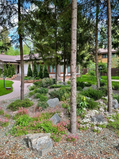 Прекрасный участок с ландшафтом, крупномерными деревьями и вымощенными дорожками. Участок граничит с лесом.
