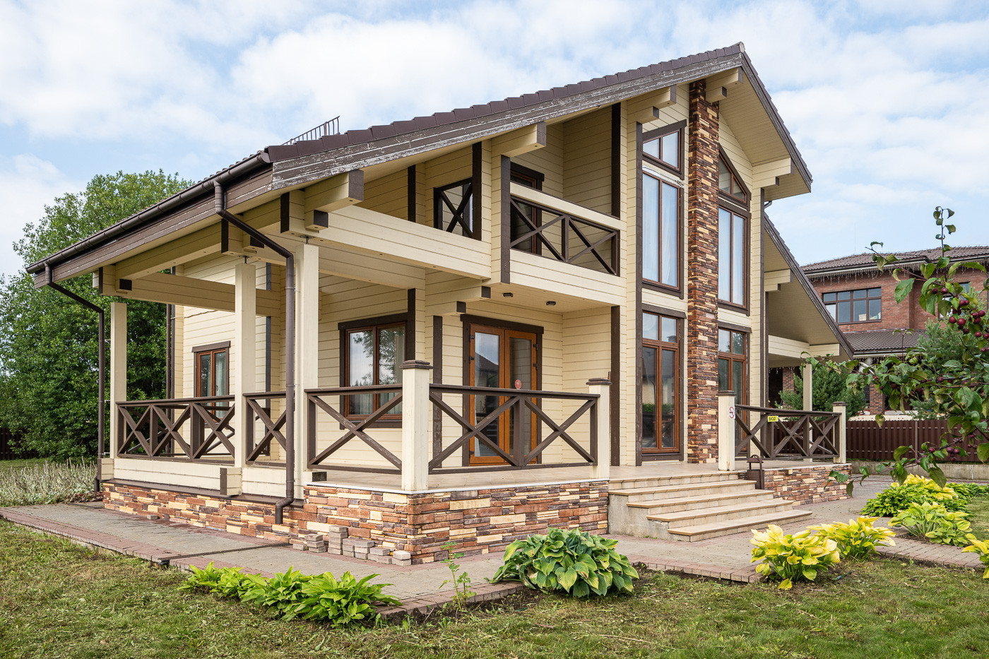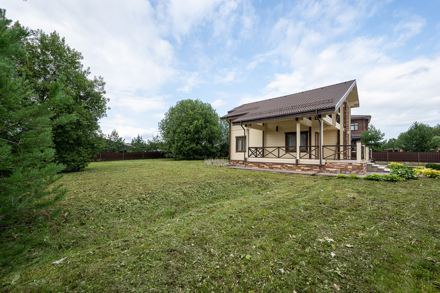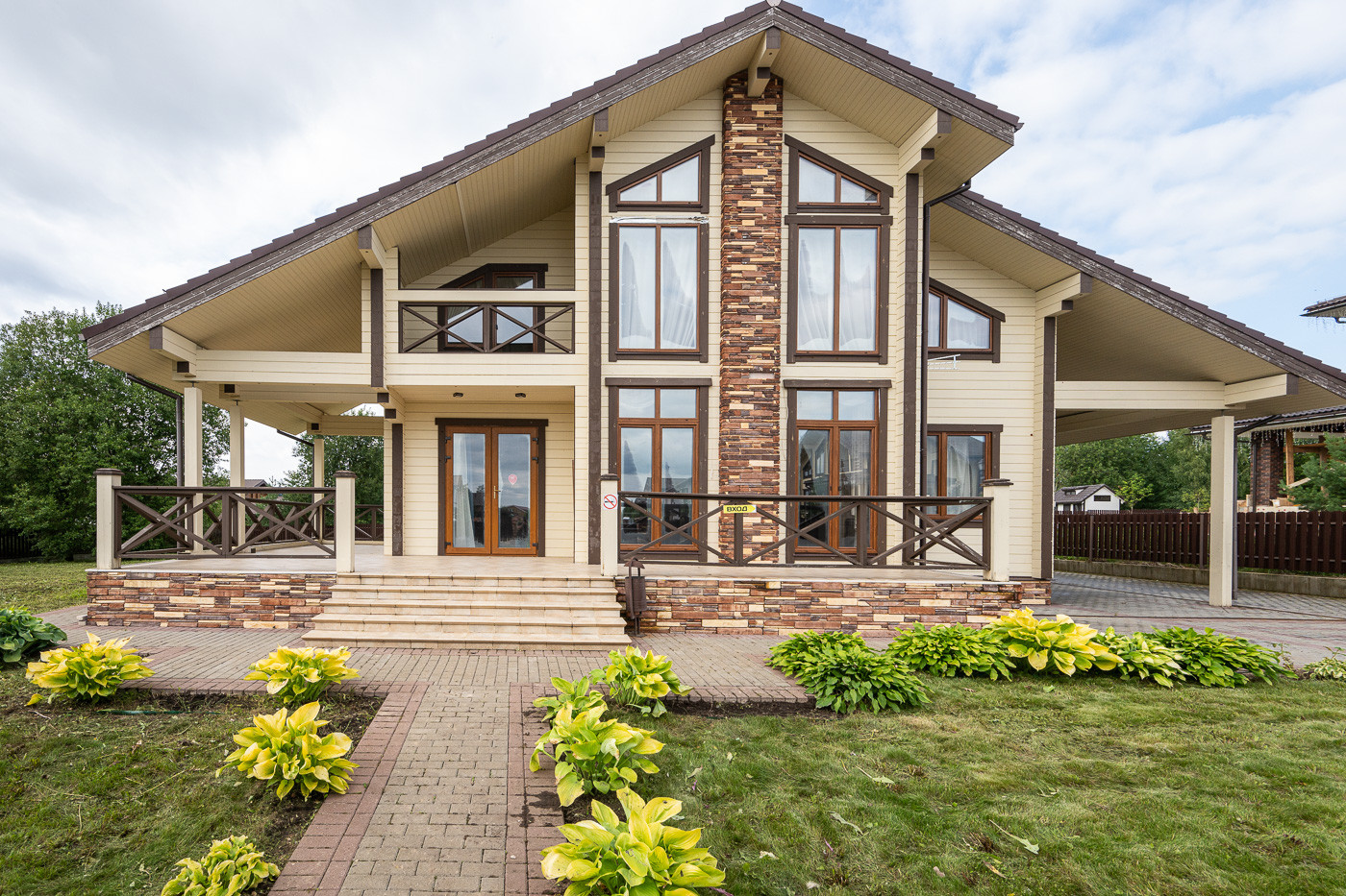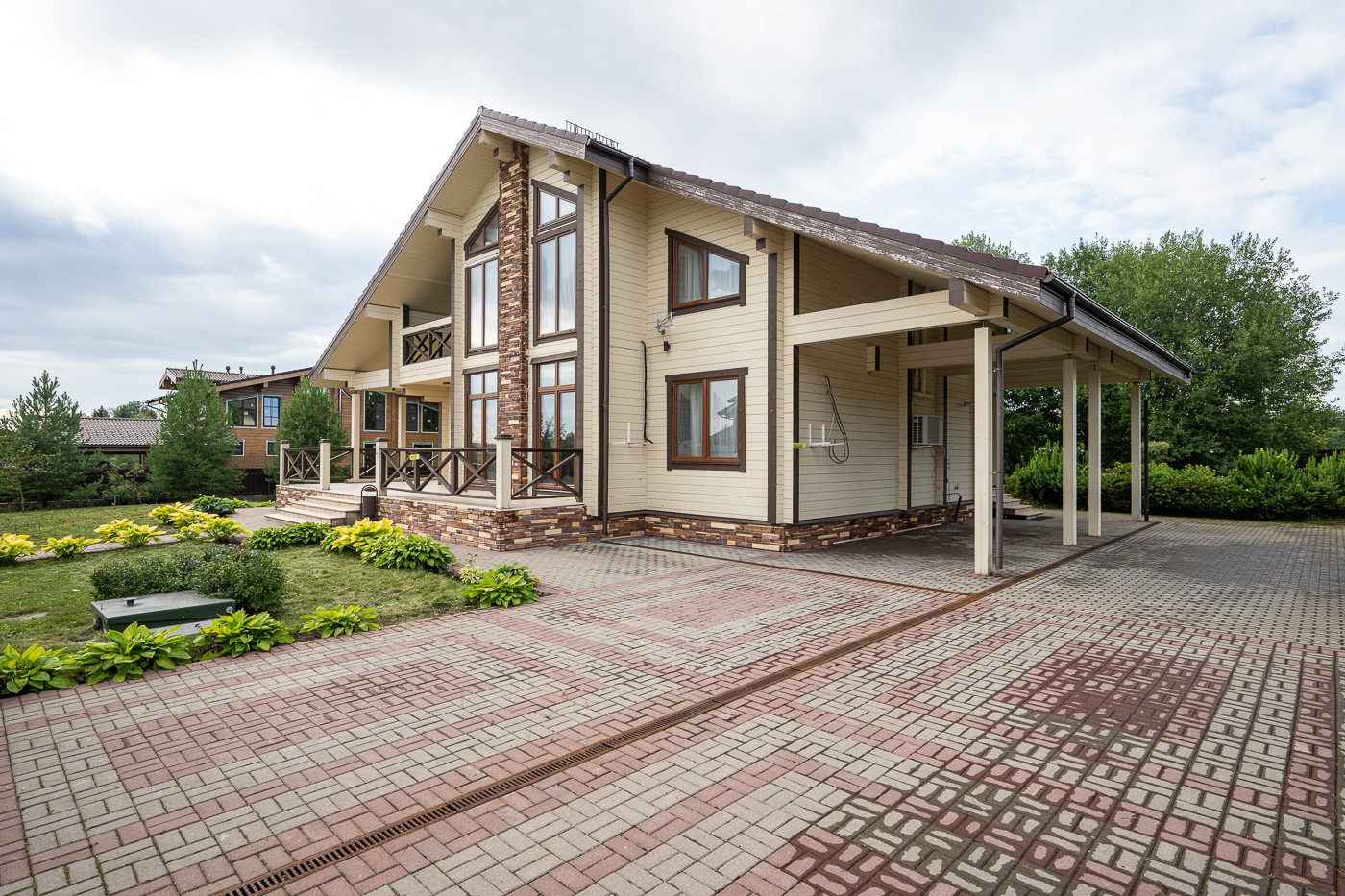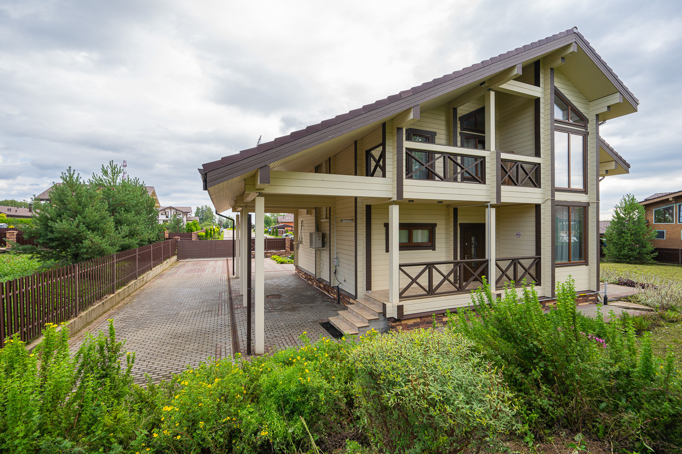 Готовый дом из клеёного бруса. На участке молодые деревья. Ландшафтный дизайн. Парковка на 6 автомобилей.