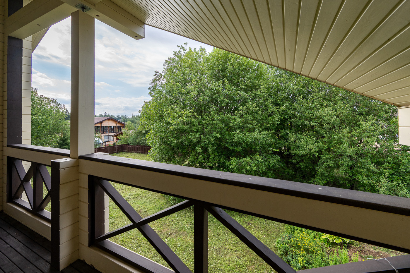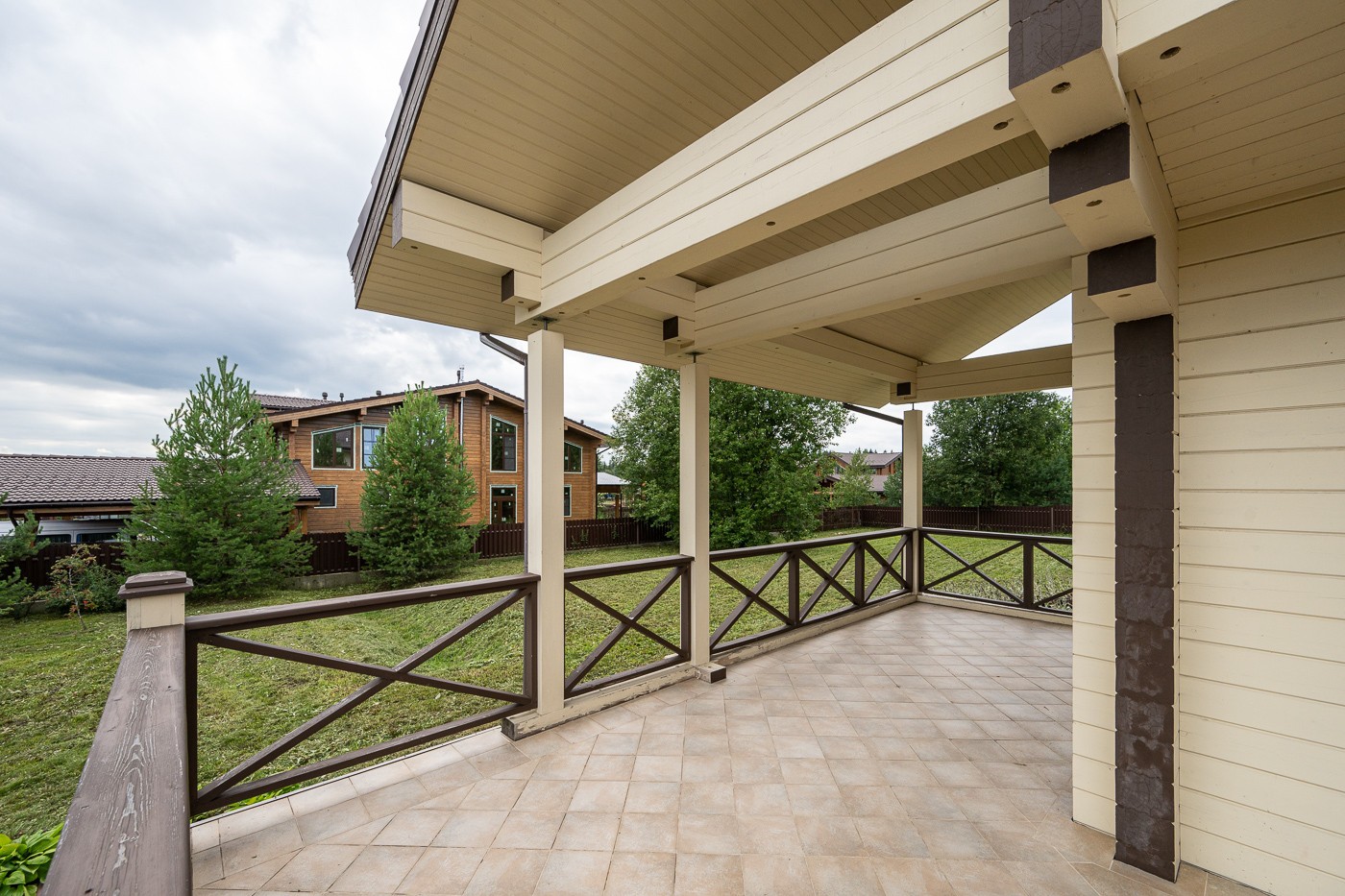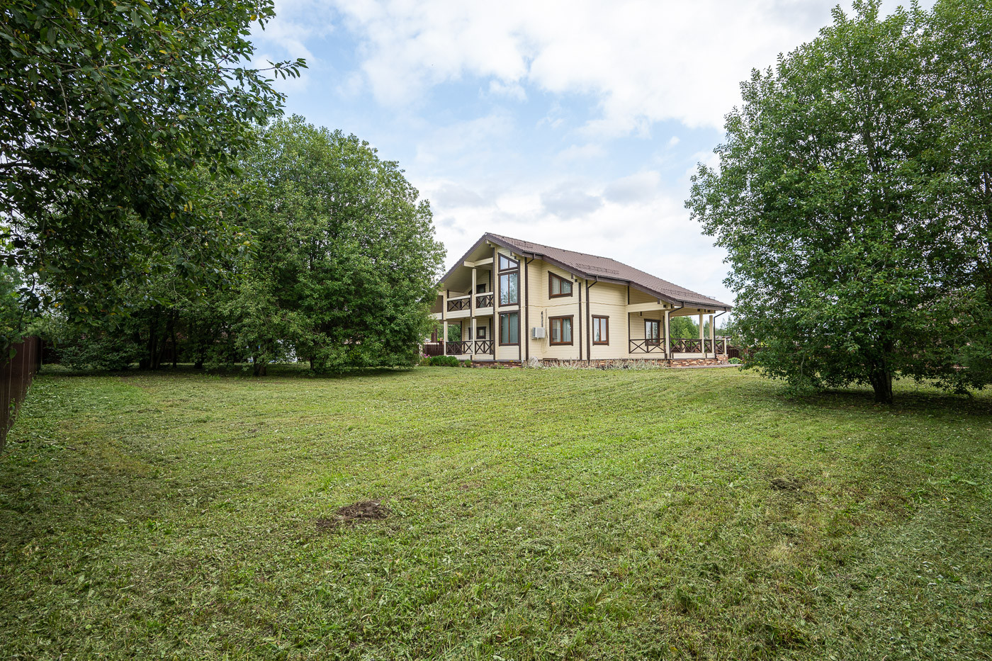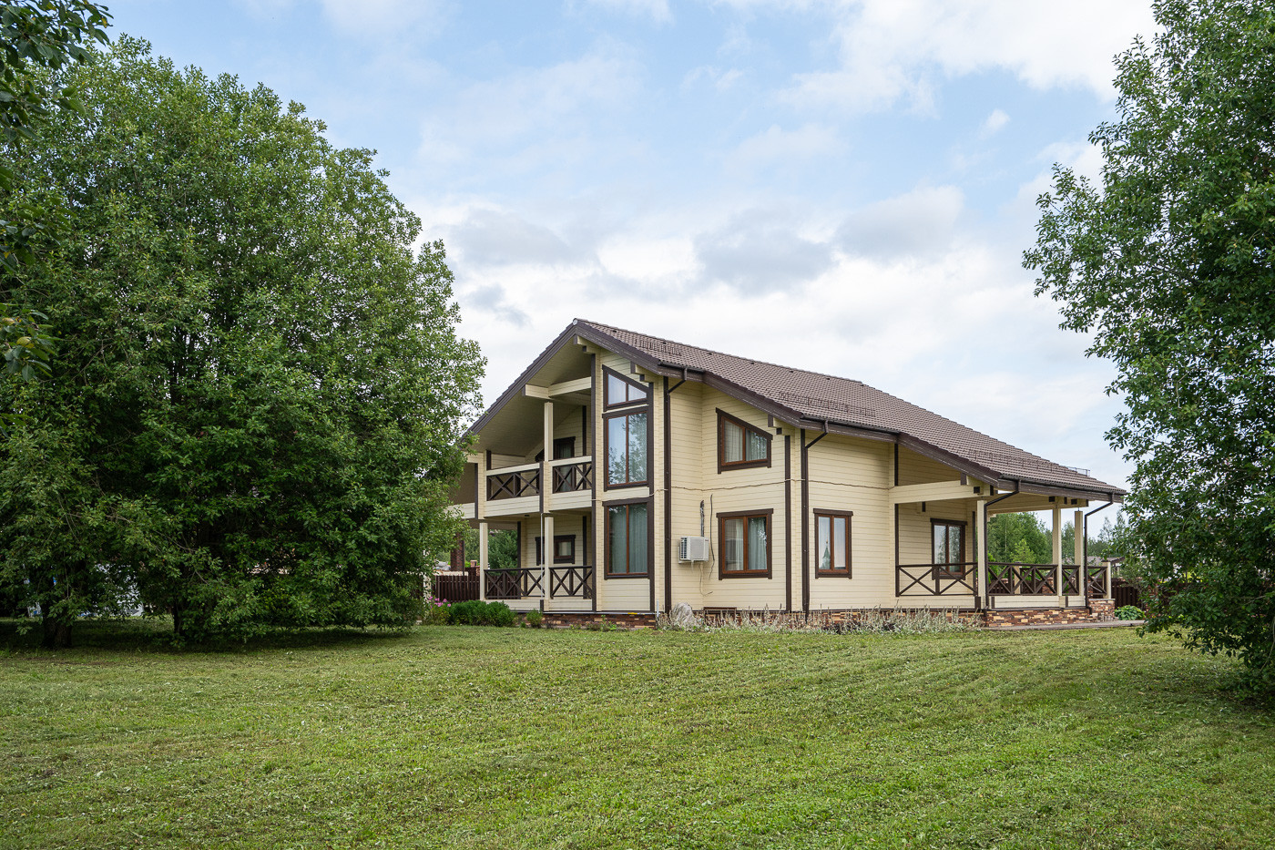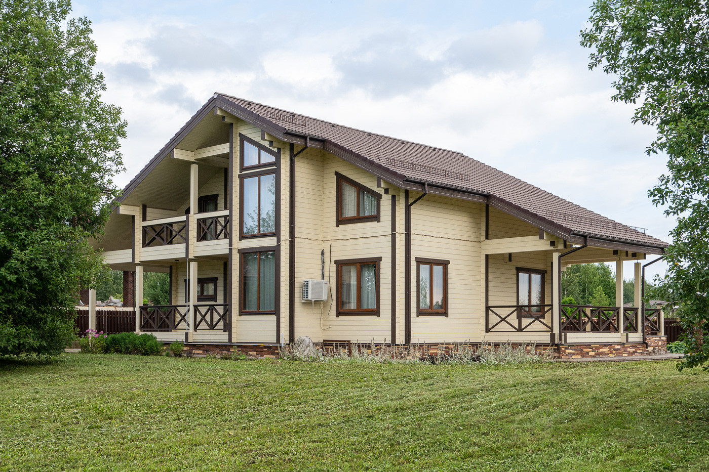 Готовый дом из клеёного бруса. На участке молодые деревья. Ландшафтный дизайн. Парковка на 6 автомобилей.