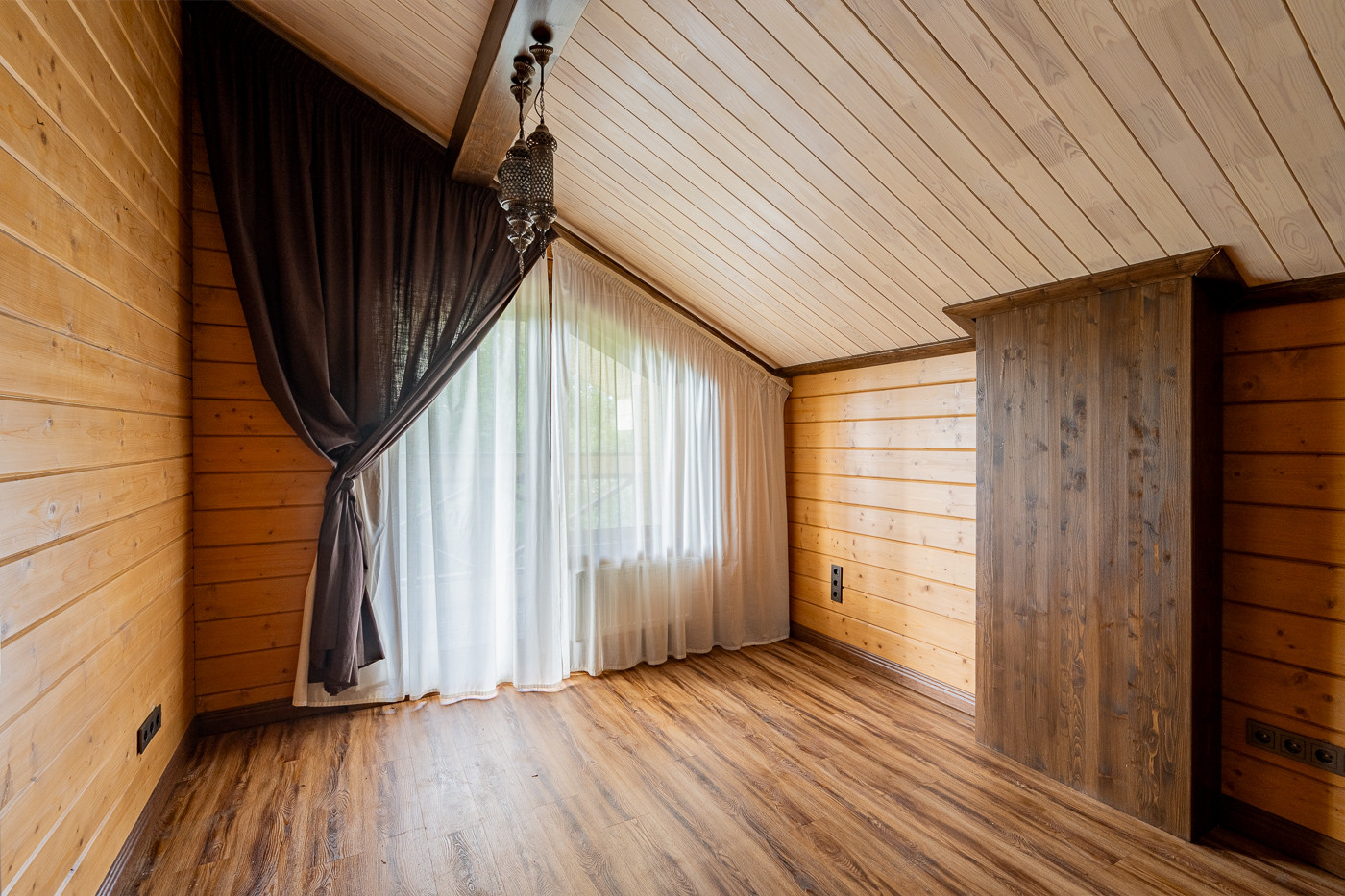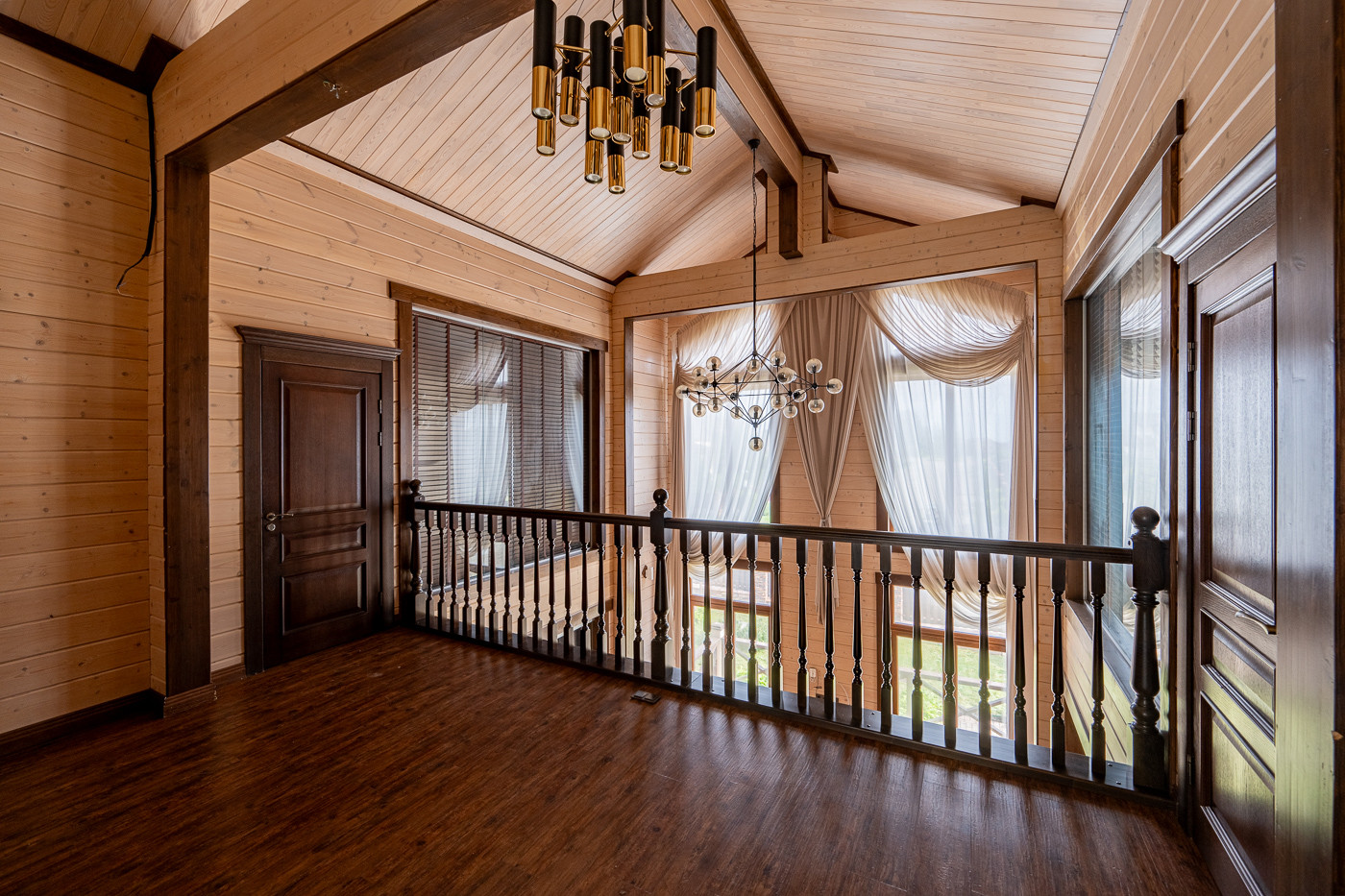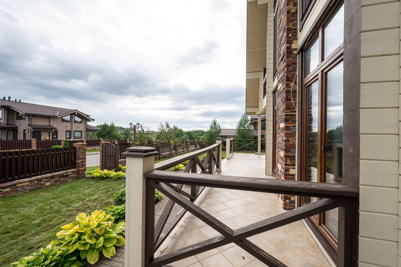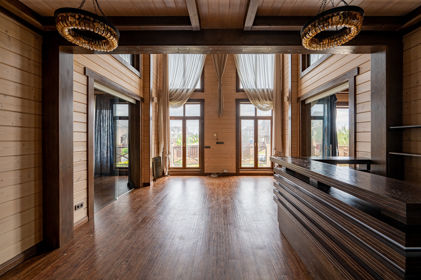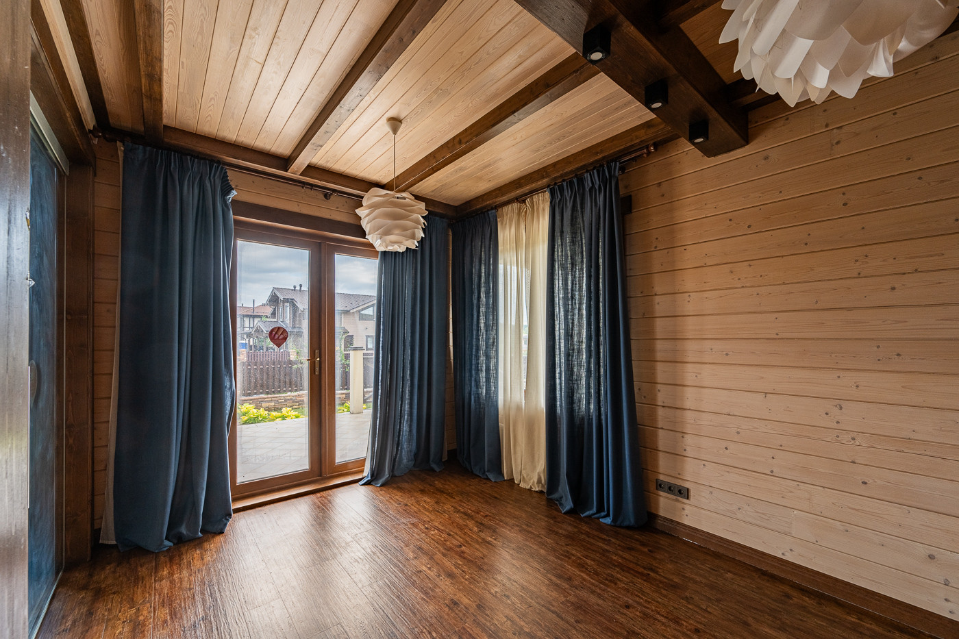 Готовый дом из клеёного бруса. На участке молодые деревья. Ландшафтный дизайн. Парковка на 6 автомобилей.