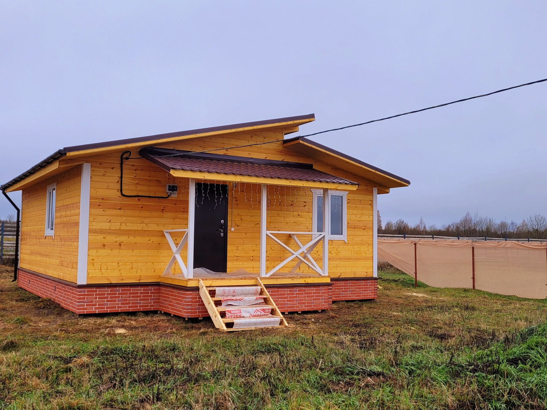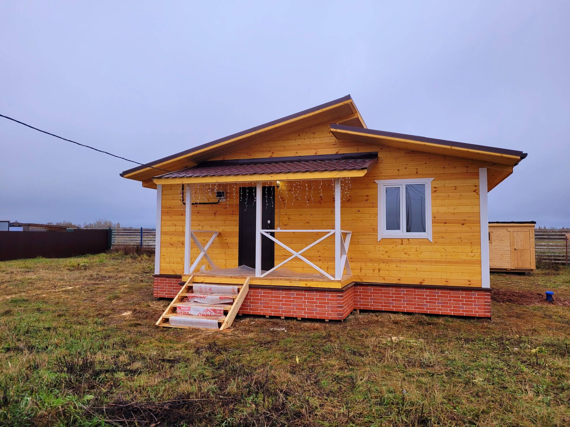 НОВЫЙ каркасный (по финской технологии) зимний дeревянный дoм в KП "Рыбицы-1" на учaстке 9 сот., с трех сторон огороженном забором. На участке установлена бытовка для хозяйственных нужд (5 кв.м.)