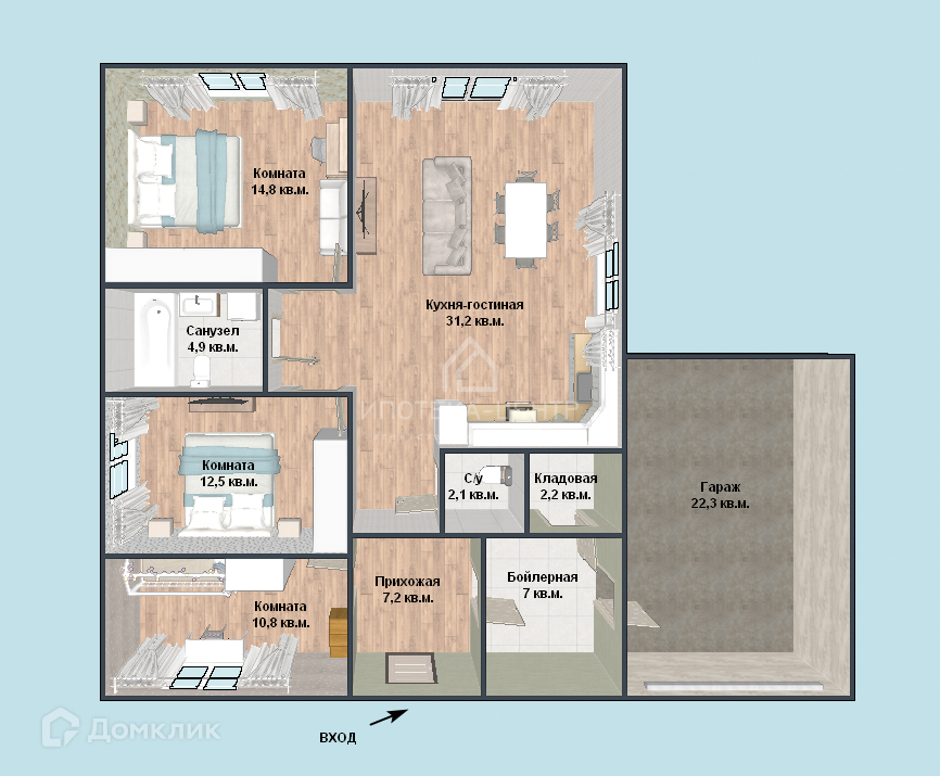 Просторная кухня - гостиная, 3 спальни, 2 санузла, топочная, кладовая, веранда и гараж!! Разве не мечта!?